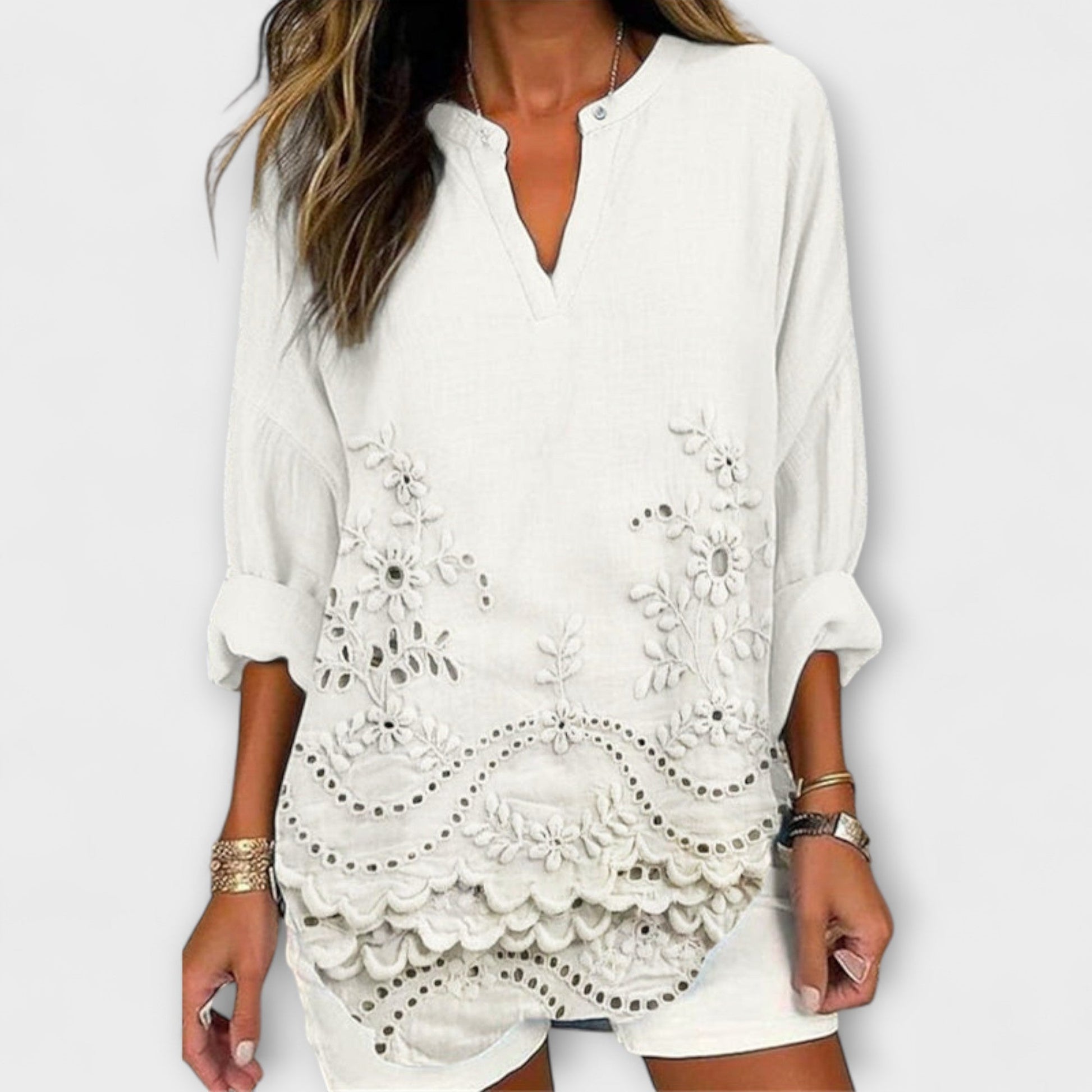 Blůza Coastal Bloom spojuje lehkost pobřežního života s elegancí ručně vyrobených detailů. Ideální pro slunečné obědy, večery u moře nebo pro pozvednutí vašeho každodenního stylu, tato blůza je jako vánek čerstvého vzduchu a květin.