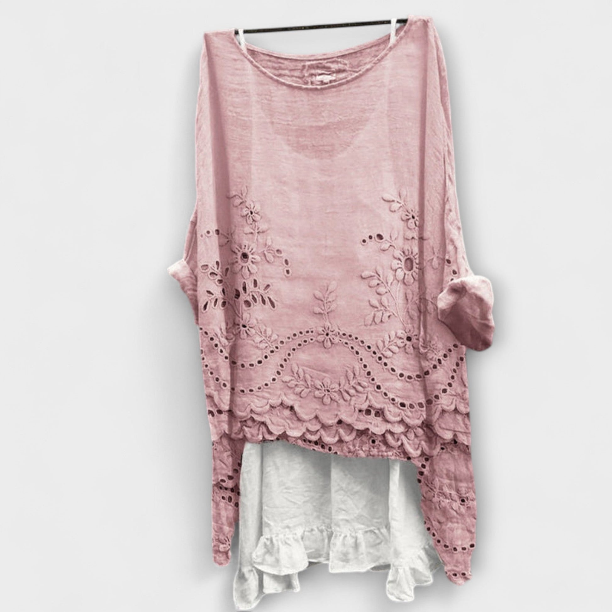 - Umělecká výšivka: Jemné květinové výřezy dodávají řemeslný a nadčasový pocit.