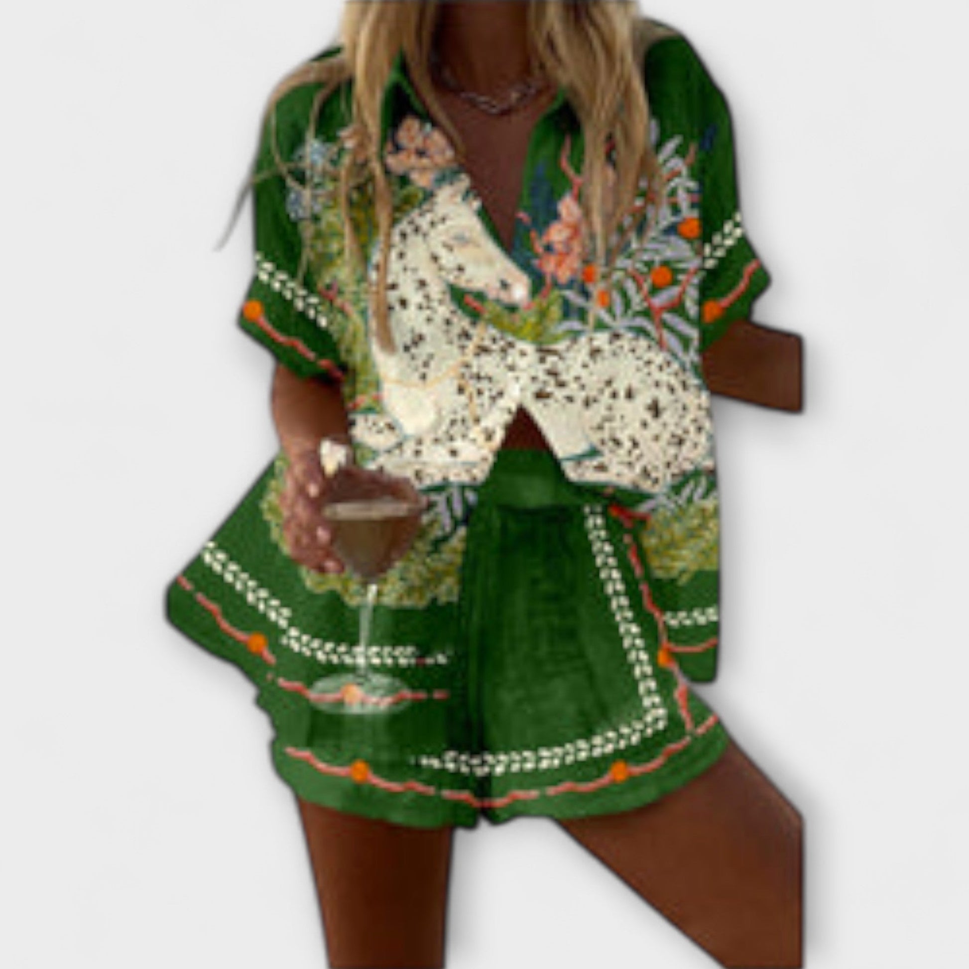 Oslavte svou svobodu se stylovým Céphira krátkým setem, který se pyšní jedinečným potiskem koně. Tento set ztělesňuje odhodlaného ducha a vzdušné pohodlí, ideální pro letní dobrodružství, ať už objevujete město nebo si užíváte přírodu.