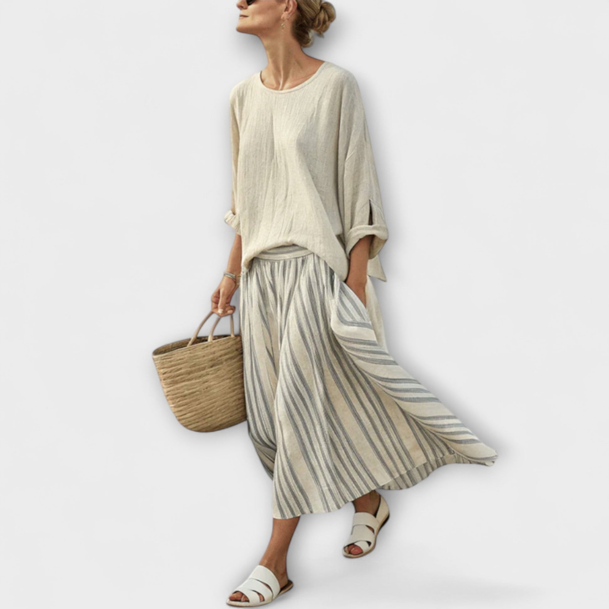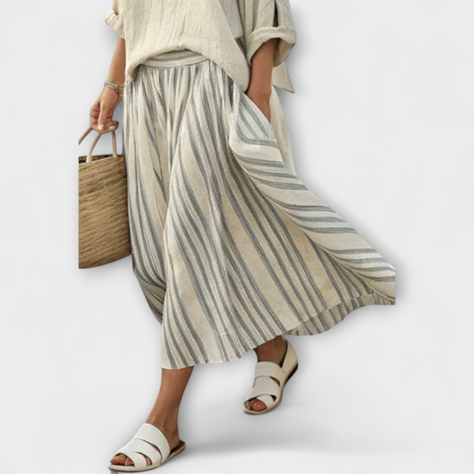 - Vzdušnou pruhovanou midi sukni, která zachycuje letní řemeslnou atmosféru
