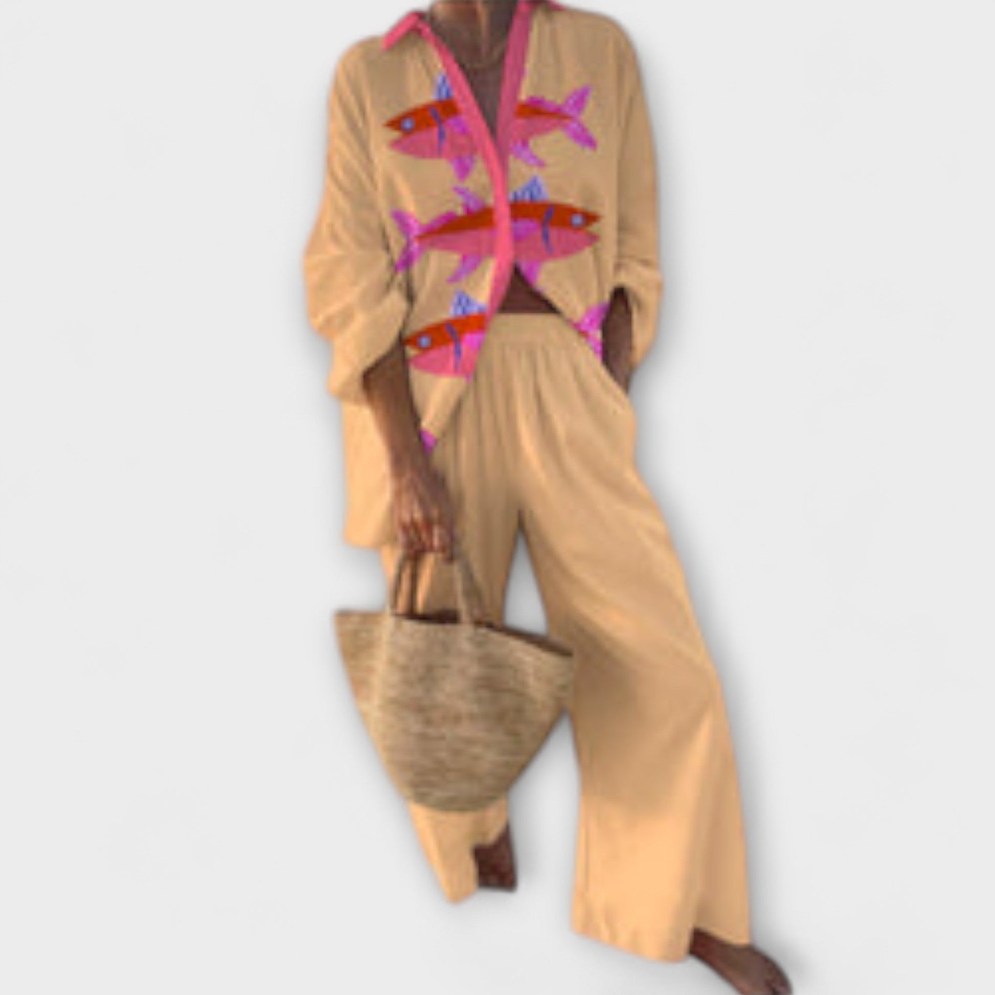 Pozvedněte svůj šatník s lněným setem Evalisse, který se pyšní okouzlujícím vzorem růžových rybiček, zachycující podstatu pobřežní krásy. Tento dvoudílný komplet je ideální pro slunné dovolené a kreativní procházky po městě.