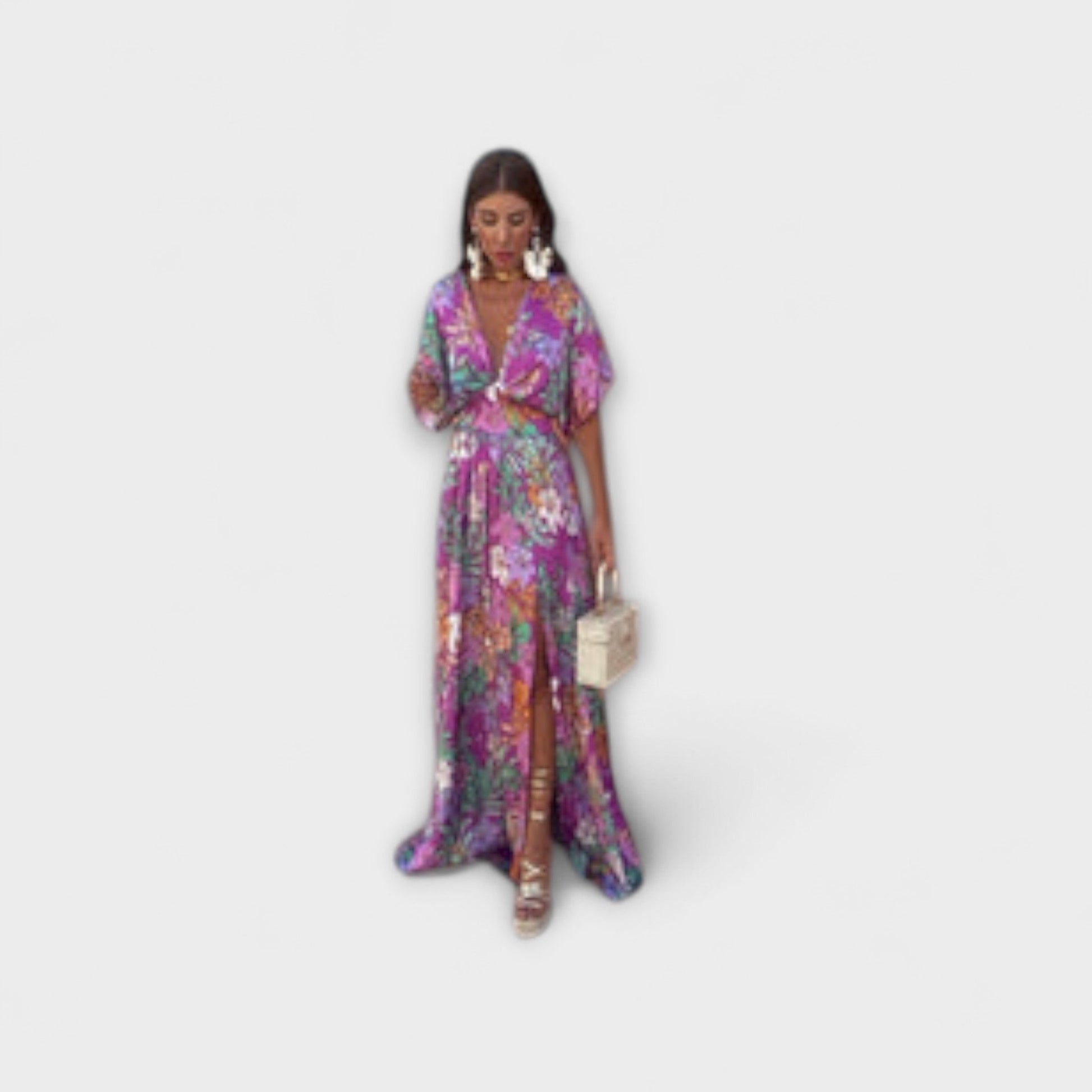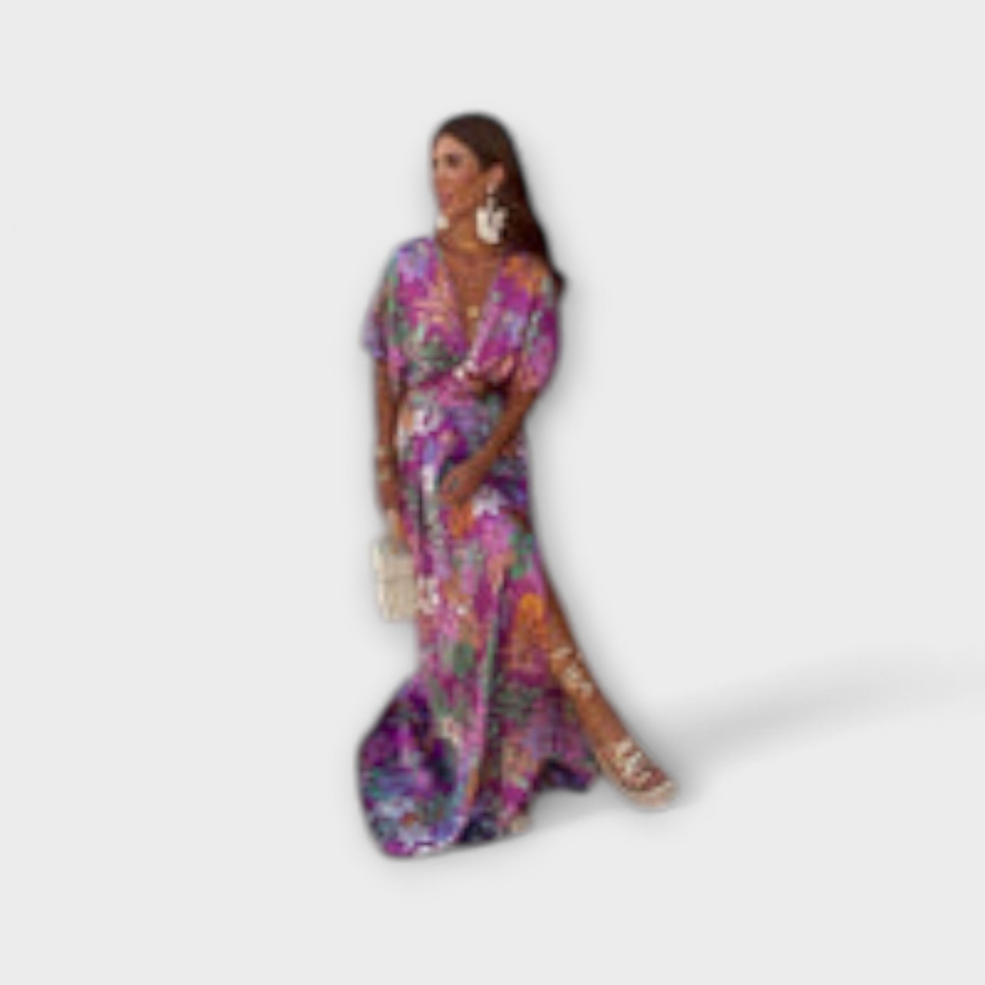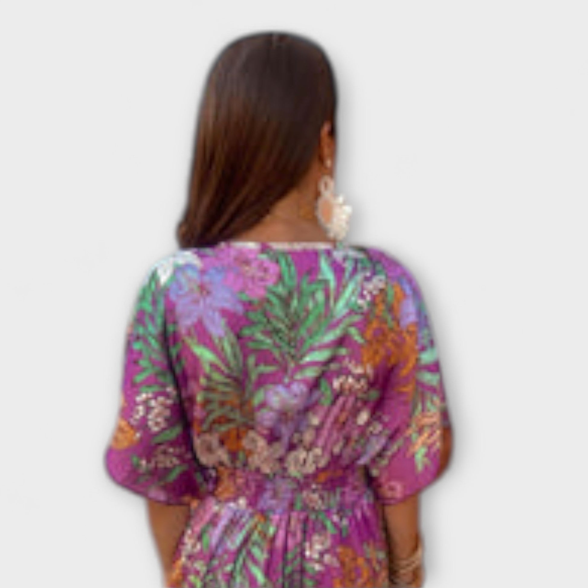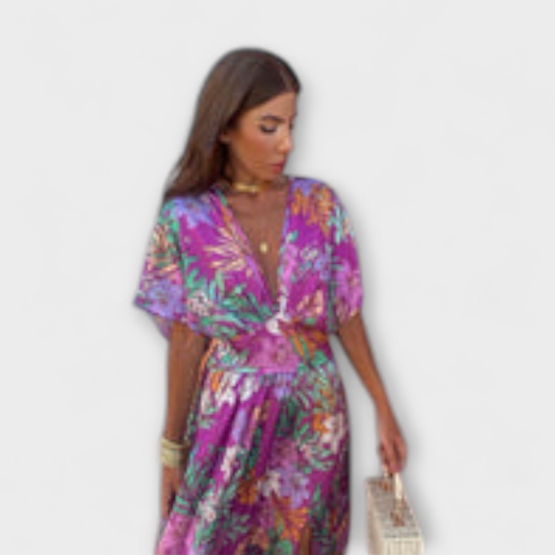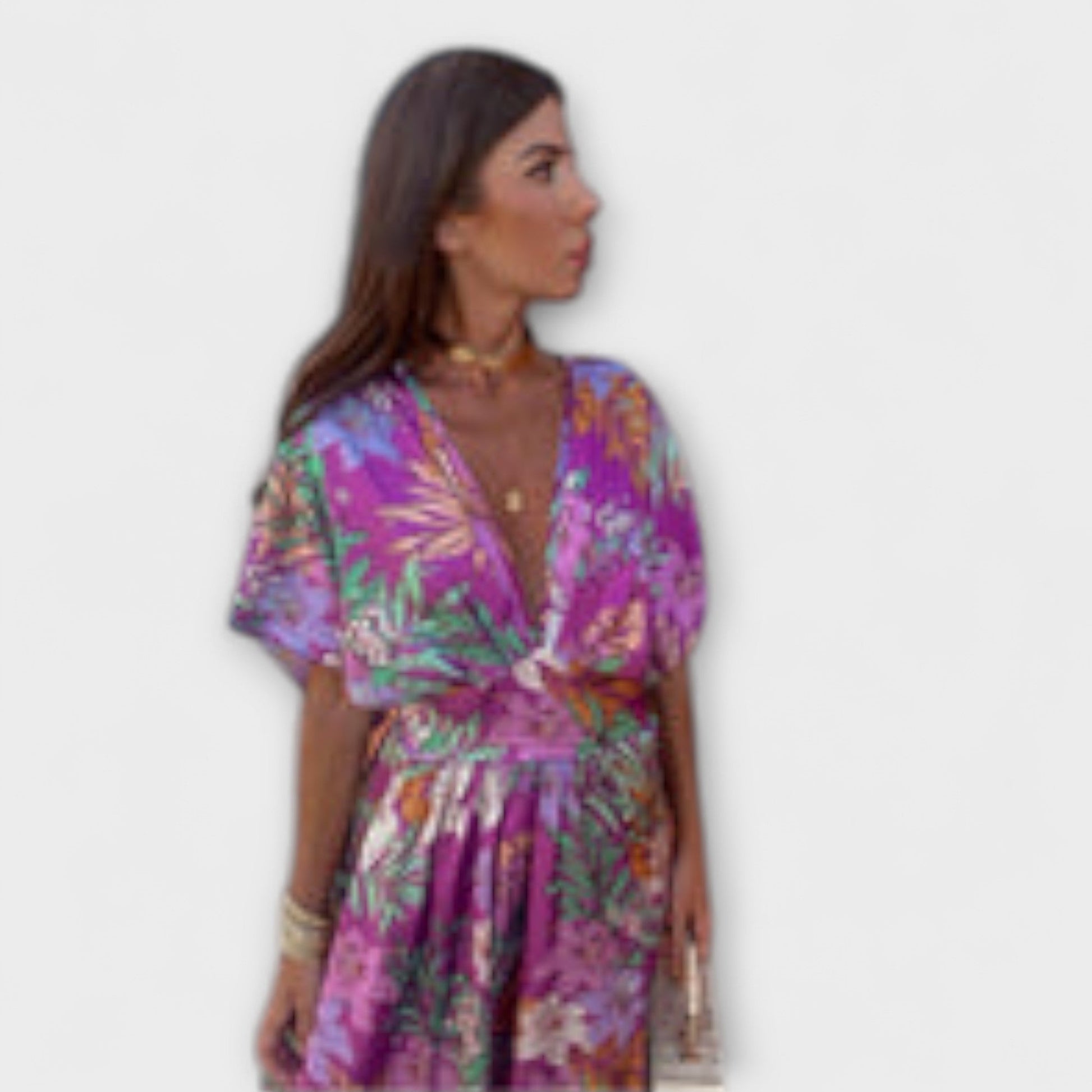Přijměte tropické kouzlo s našimi šaty Gemma, ideálními pro elegantní letní dny. Tyto šaty s živým květinovým vzorem a lichotivým zavinovacím výstřihem nabízejí svěží, ženský a mírně bohémský vzhled.