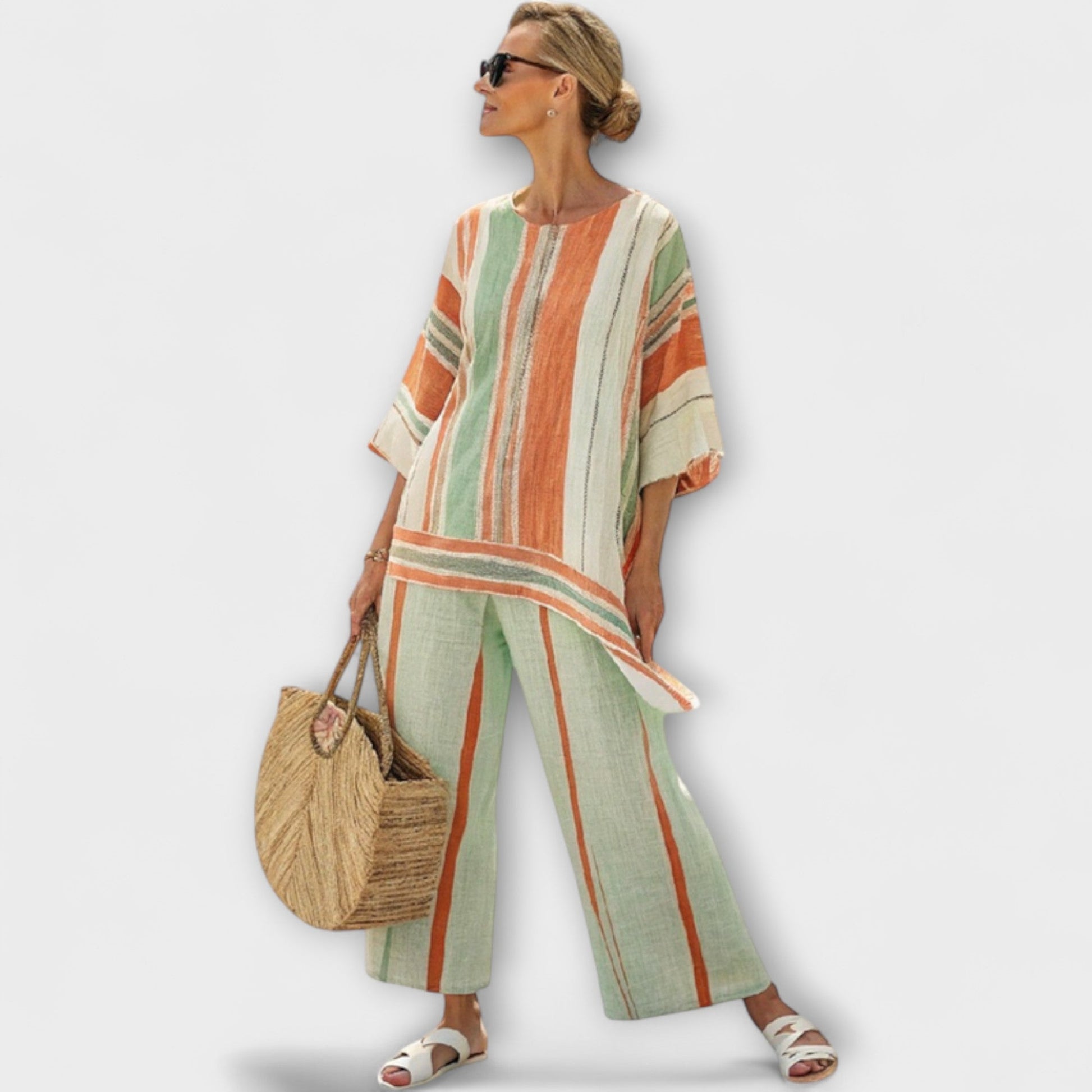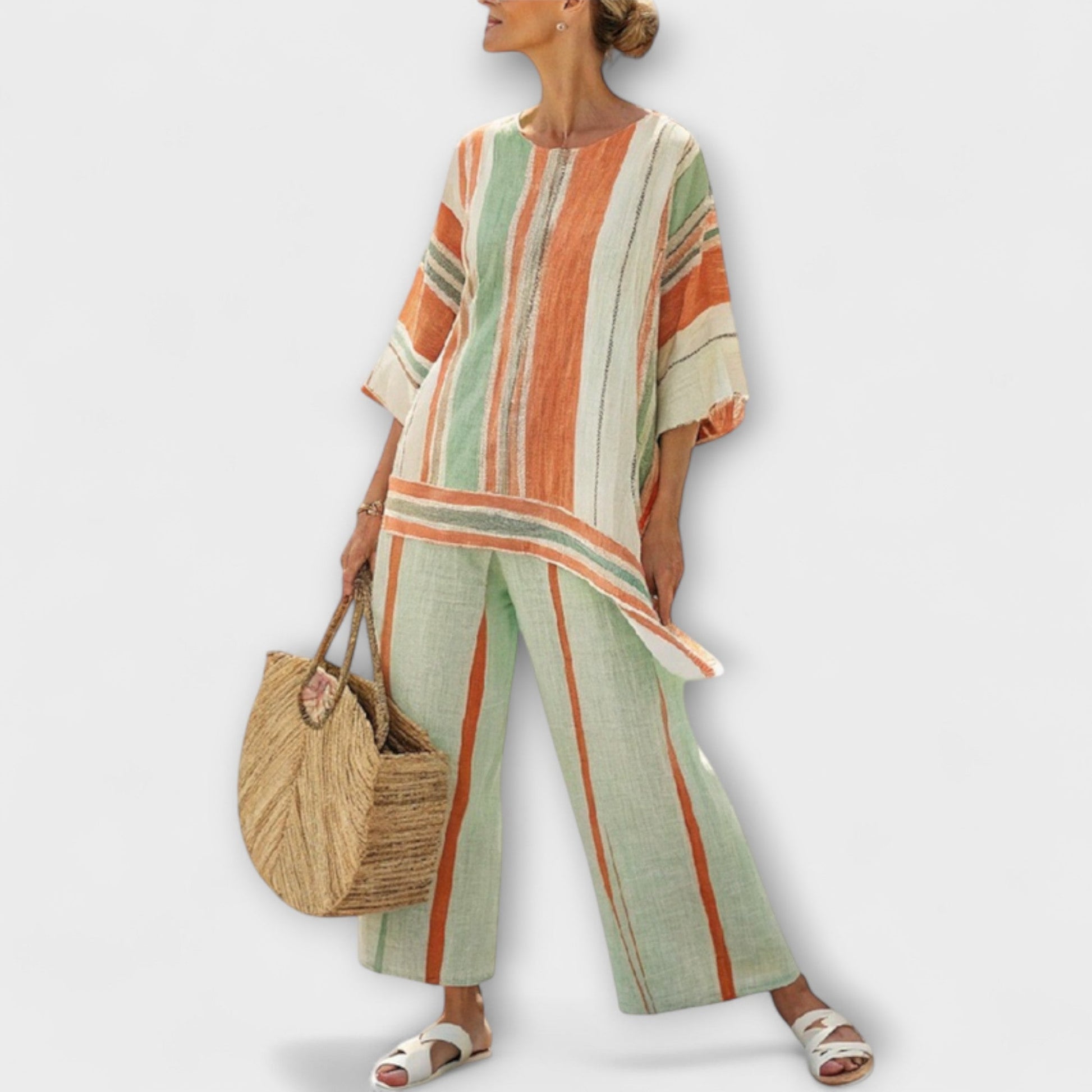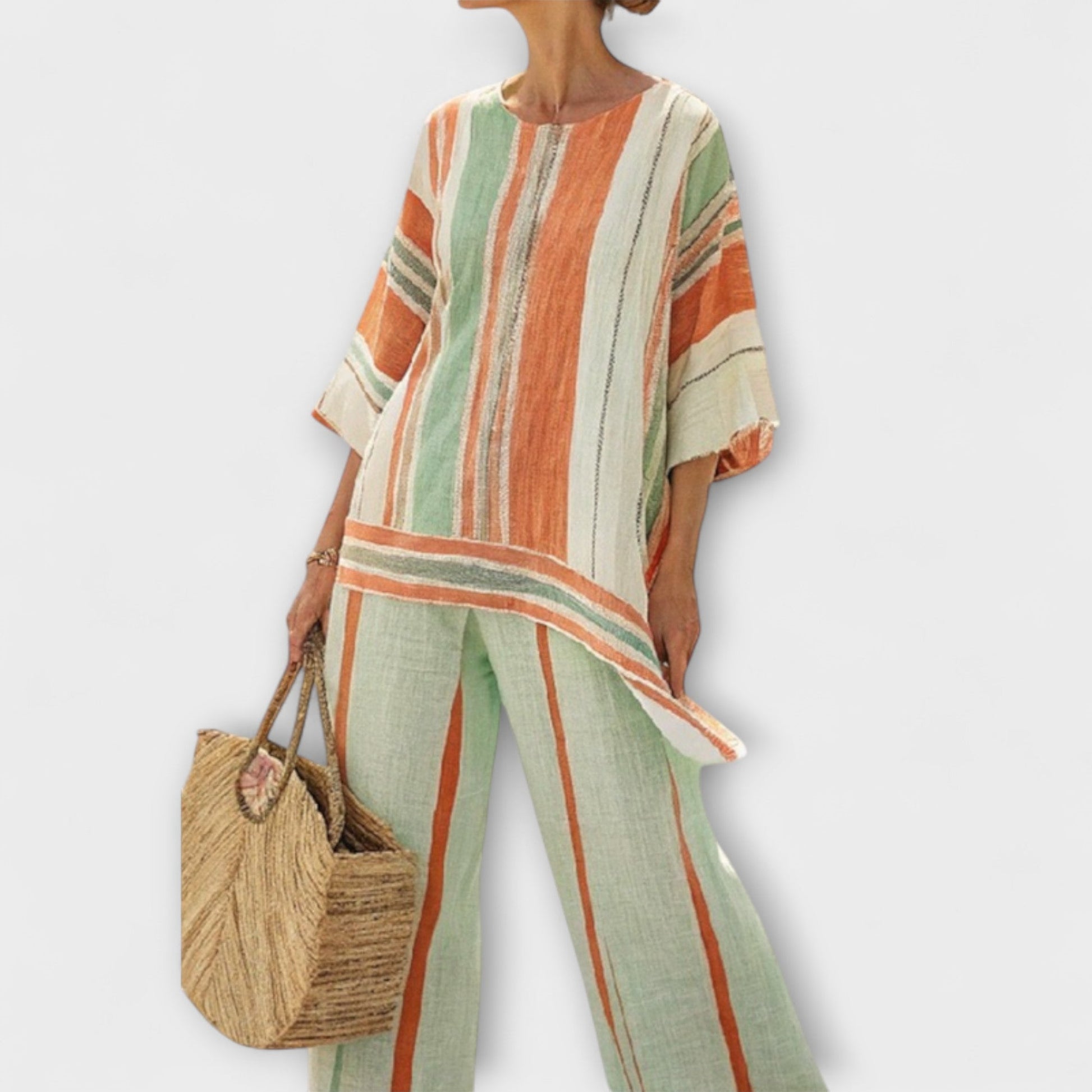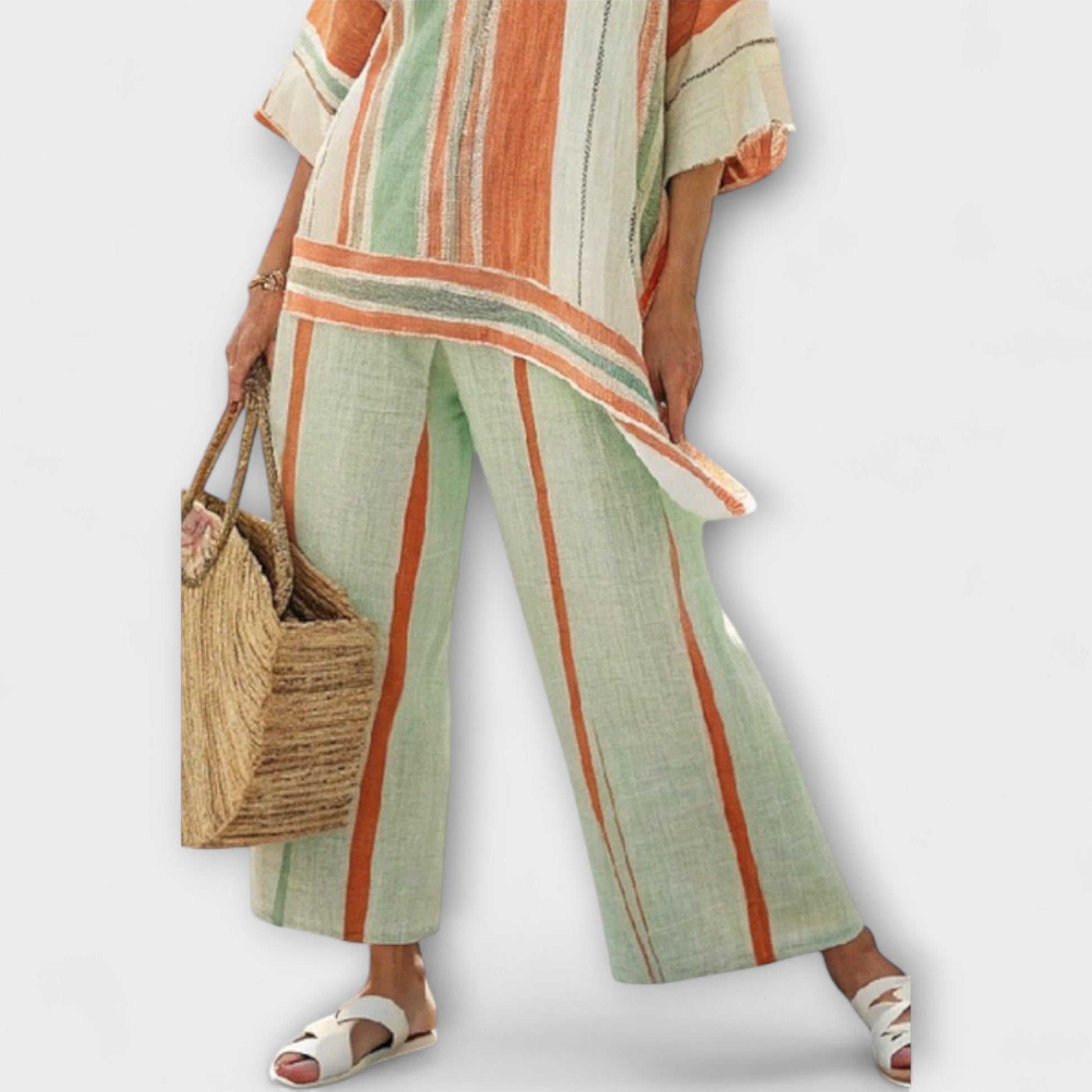 Zažijte dokonalou kombinaci pohodlí a stylu s naší sadou Daisy, která obsahuje živou, pestrou pruhovanou blůzu spárovanou s odpovídajícími širokými kalhotami.