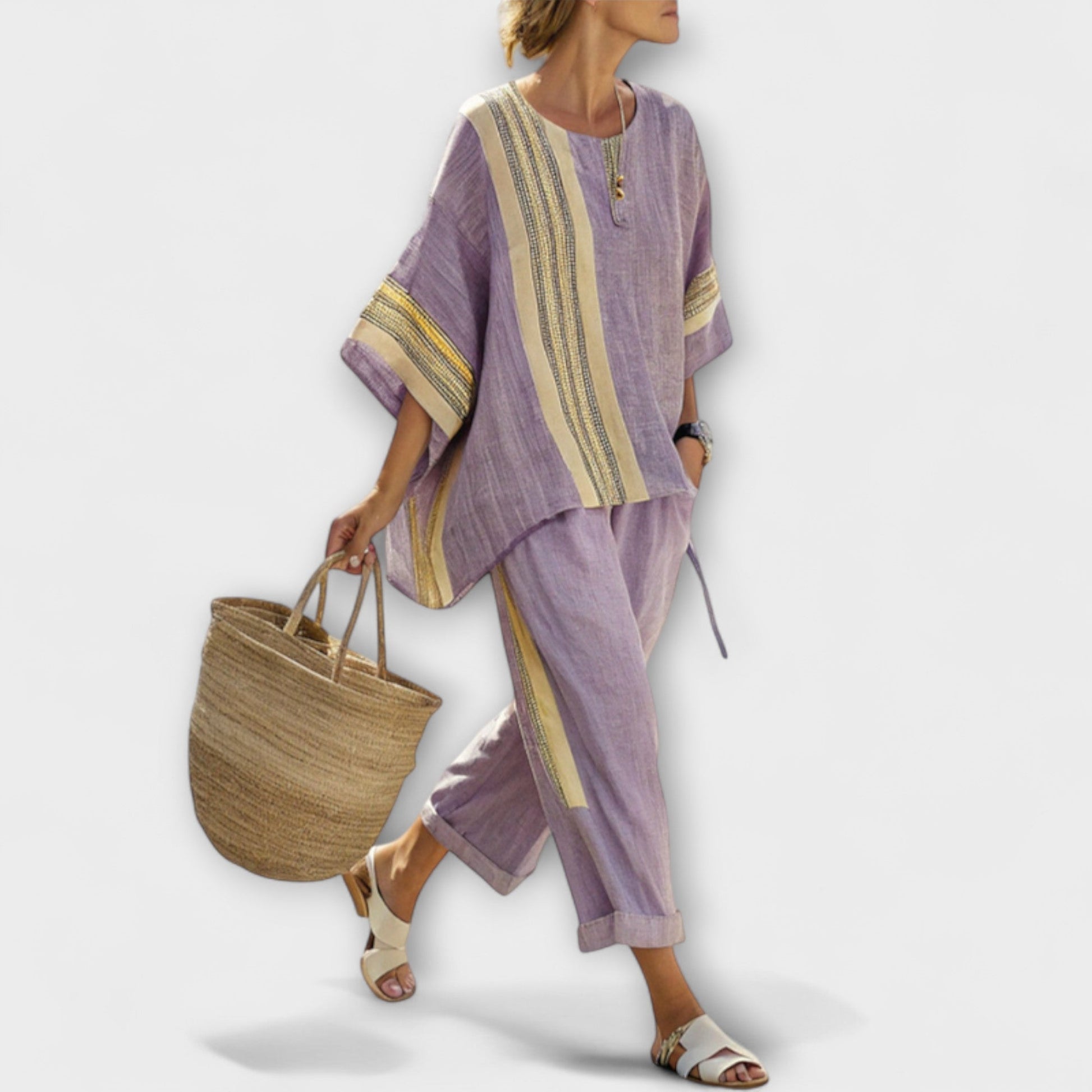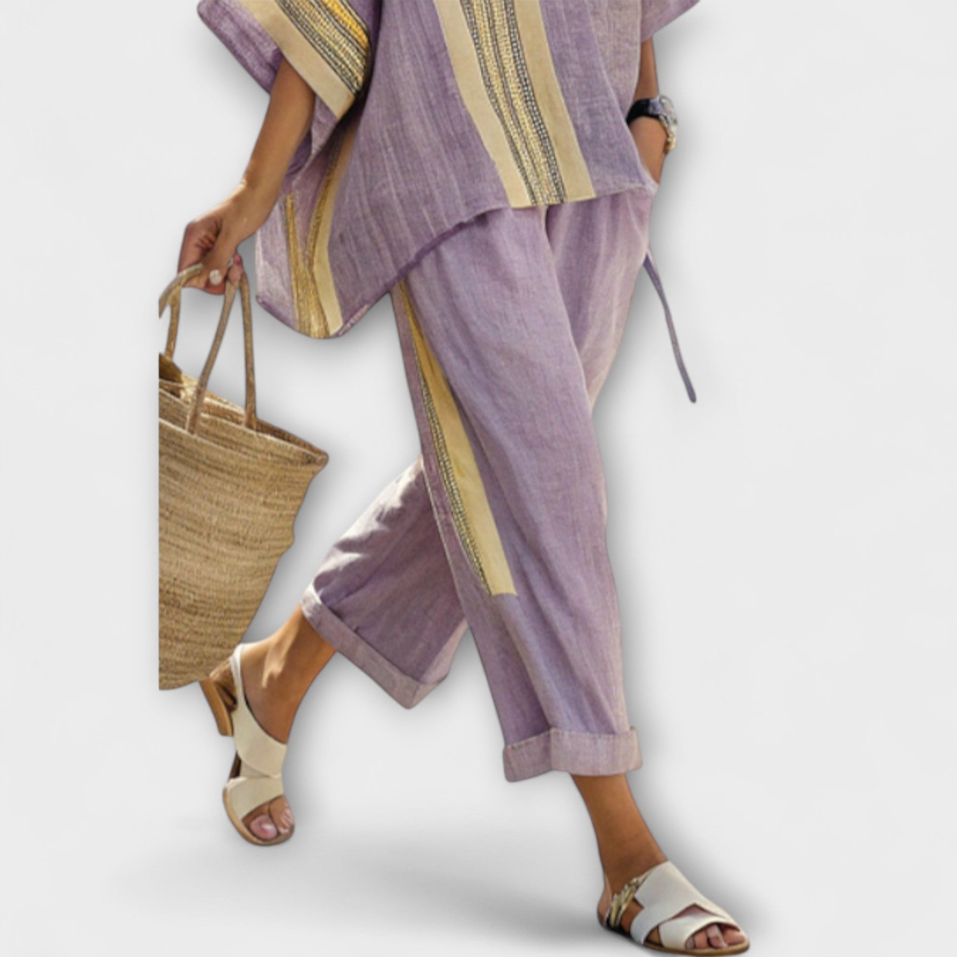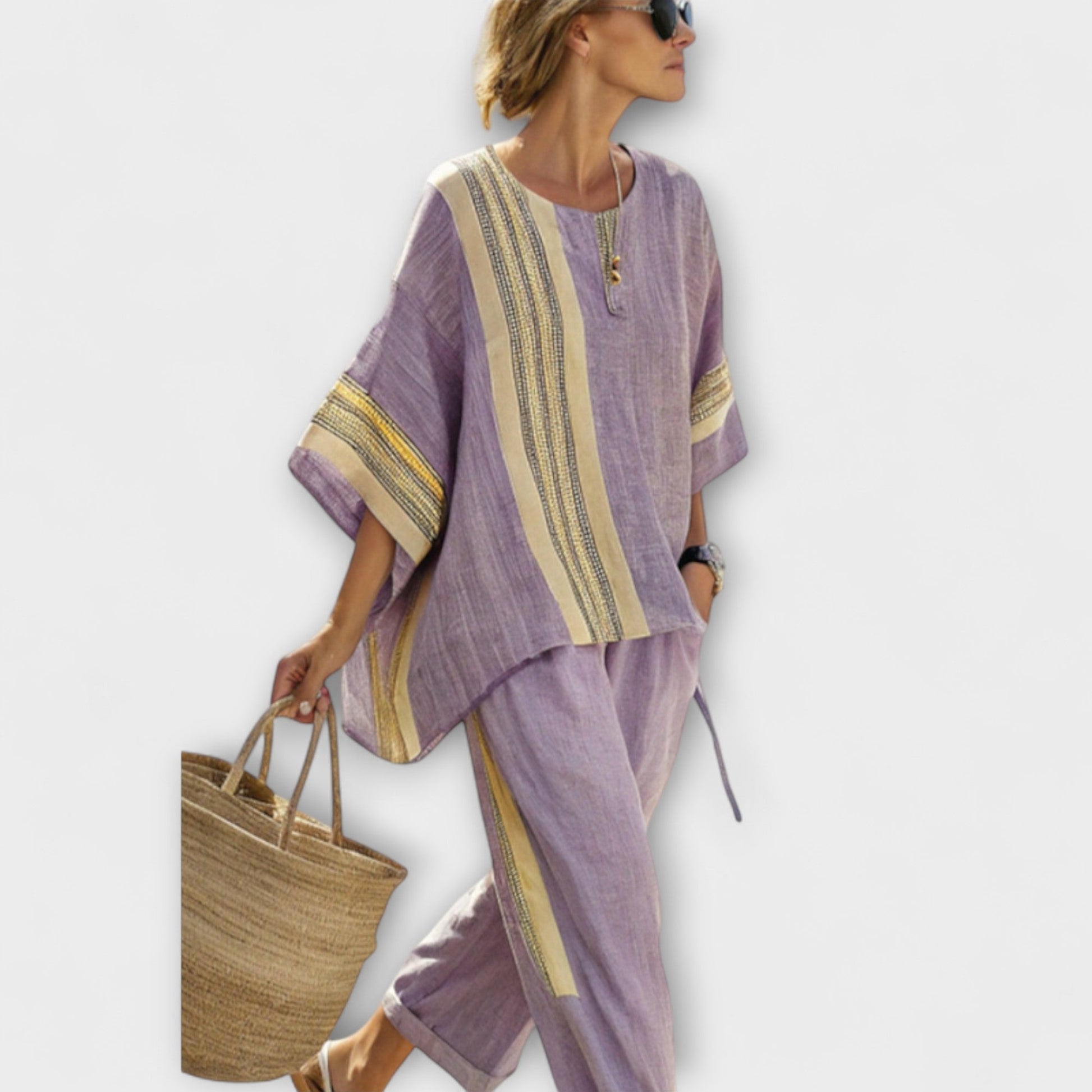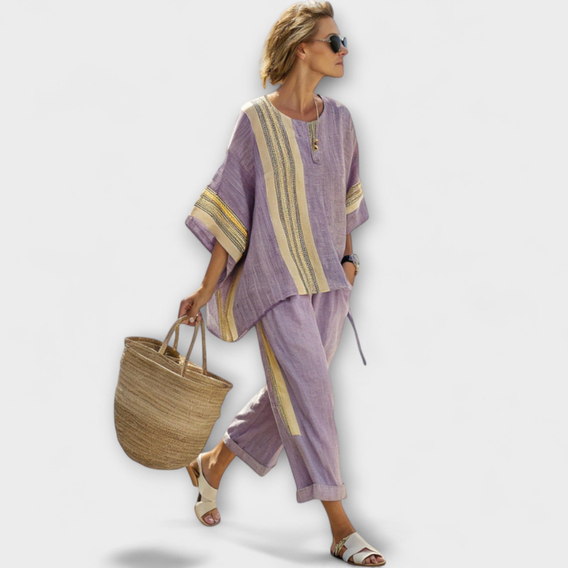 Objevte sadu Daisy – spojení uvolněné elegance a uměleckého nádechu. Tento ohromující komplet v jemné levandulové barvě s hořčicovými akcenty přináší do vašeho šatníku dotek přírodní svěžesti, ideální pro procházky u moře nebo pohodové letní odpoledne.