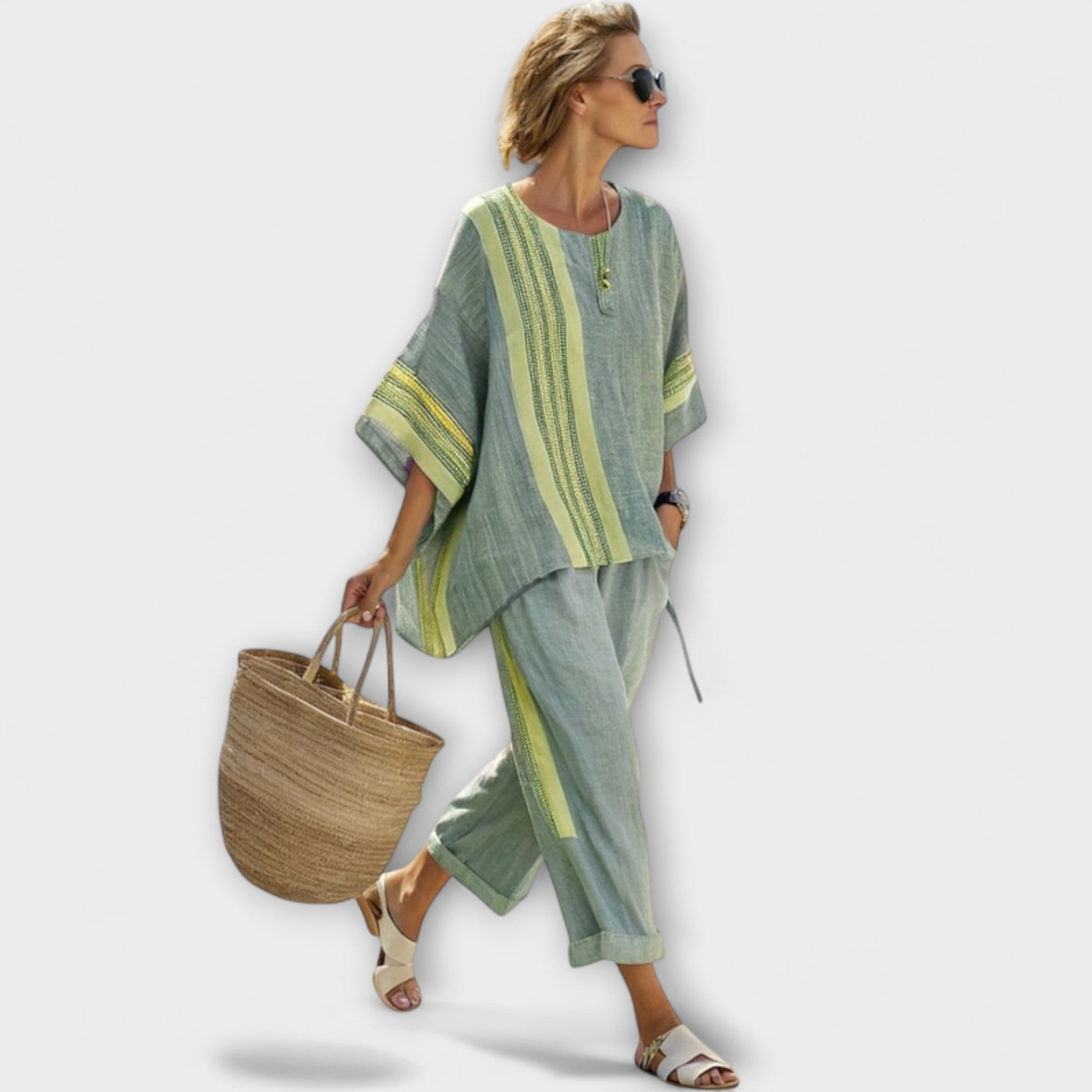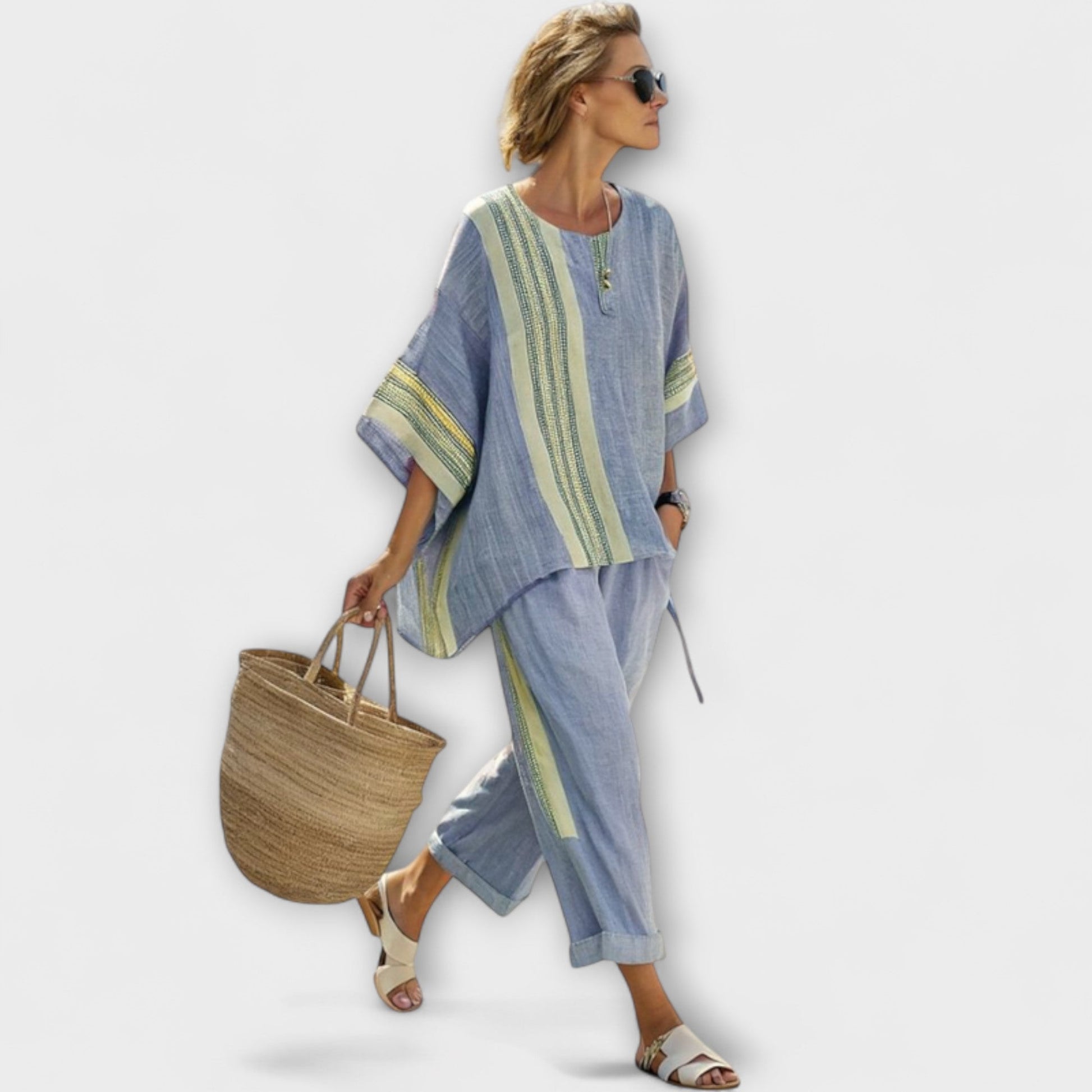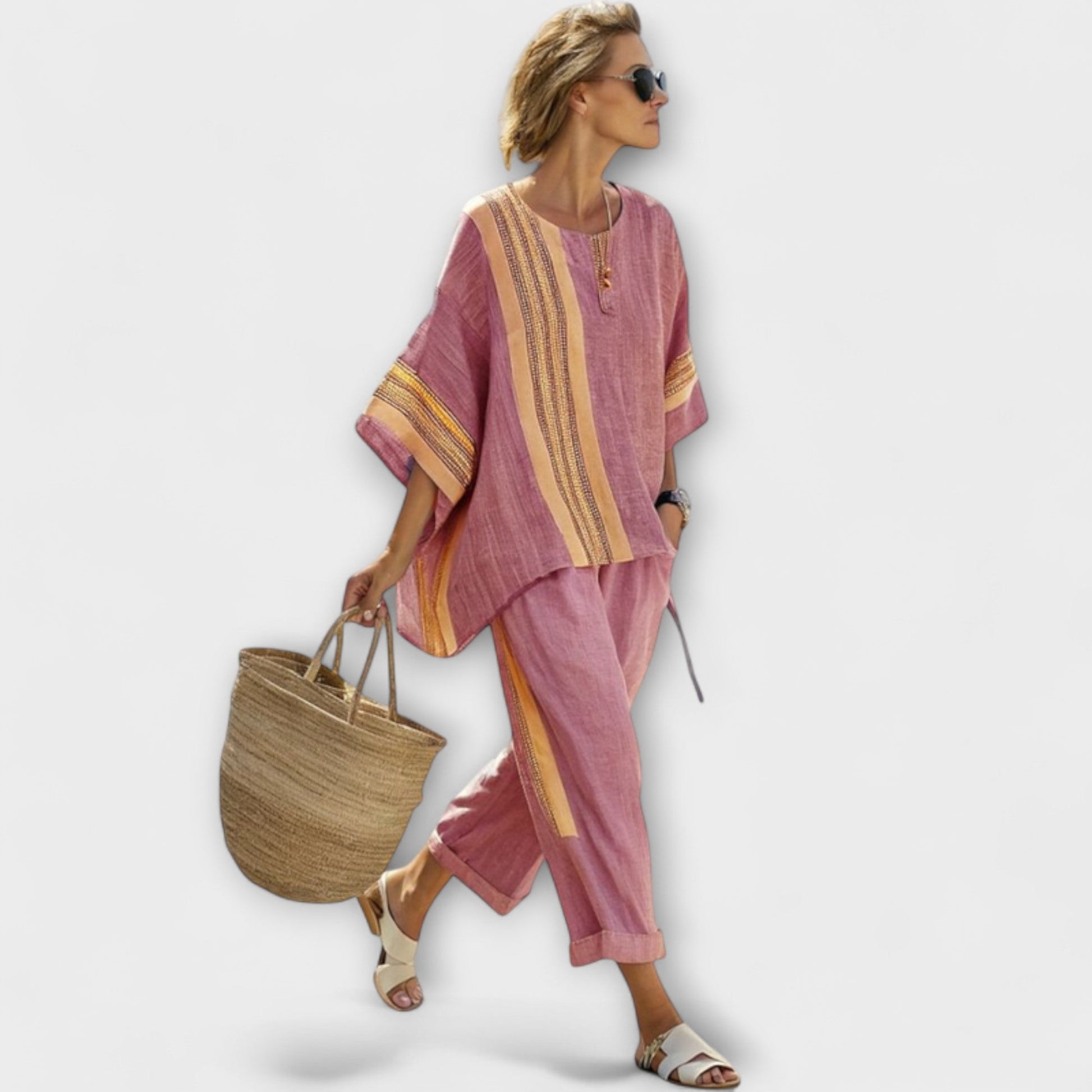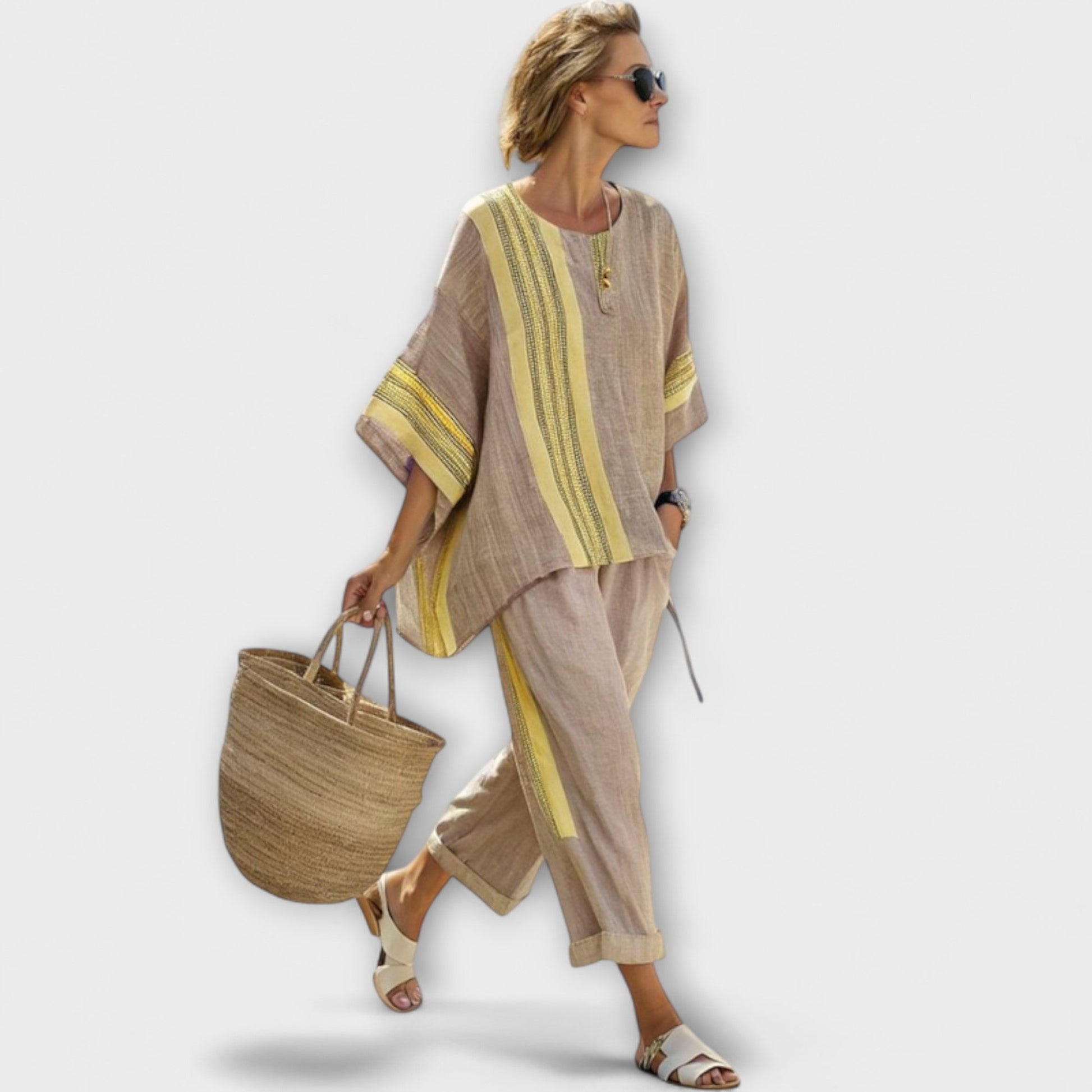 Objevte sadu Daisy – spojení uvolněné elegance a uměleckého nádechu. Tento ohromující komplet v jemné levandulové barvě s hořčicovými akcenty přináší do vašeho šatníku dotek přírodní svěžesti, ideální pro procházky u moře nebo pohodové letní odpoledne.