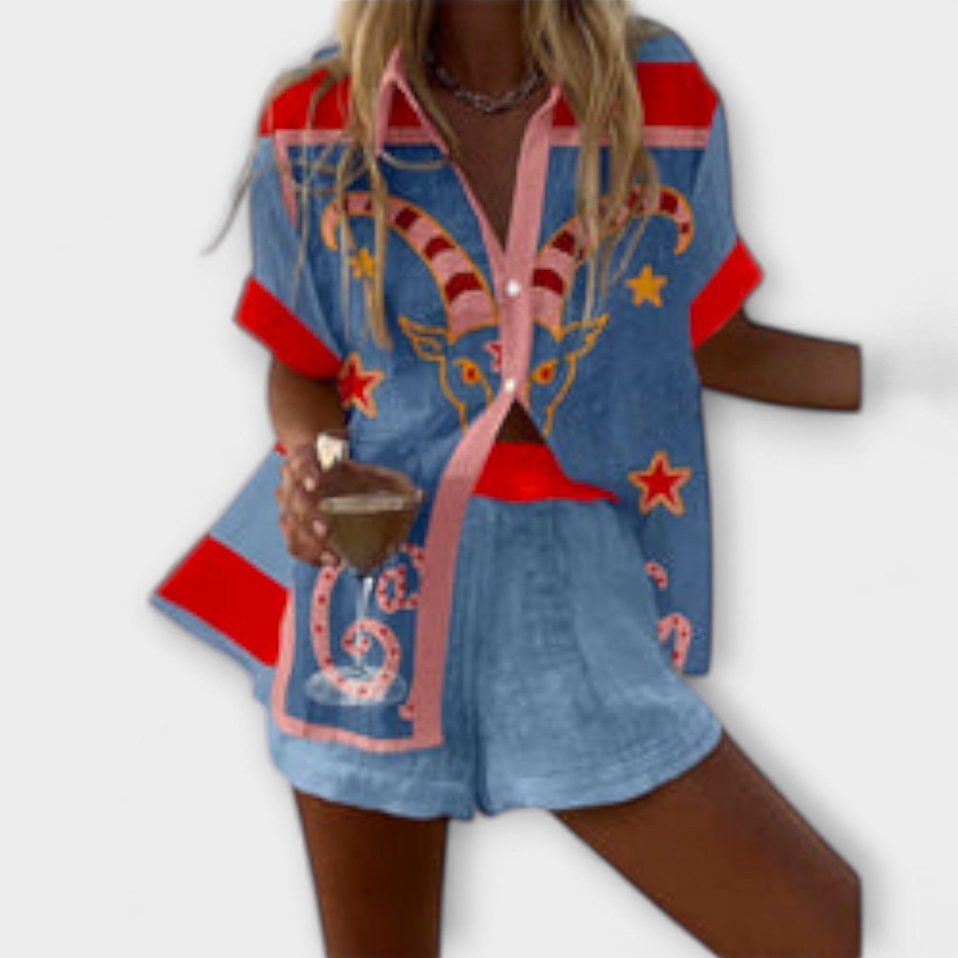 Oslavte ducha léta s outfitem Jorelle. Tento živý dvoudílný set s veselým vzorem koz je vyroben z lehkého materiálu, který dodává vaší garderobě zábavný nádech. Ideální na trhy nebo pohodové odpoledne venku, Jorelle přináší osvěžující energii do vašeho stylu.