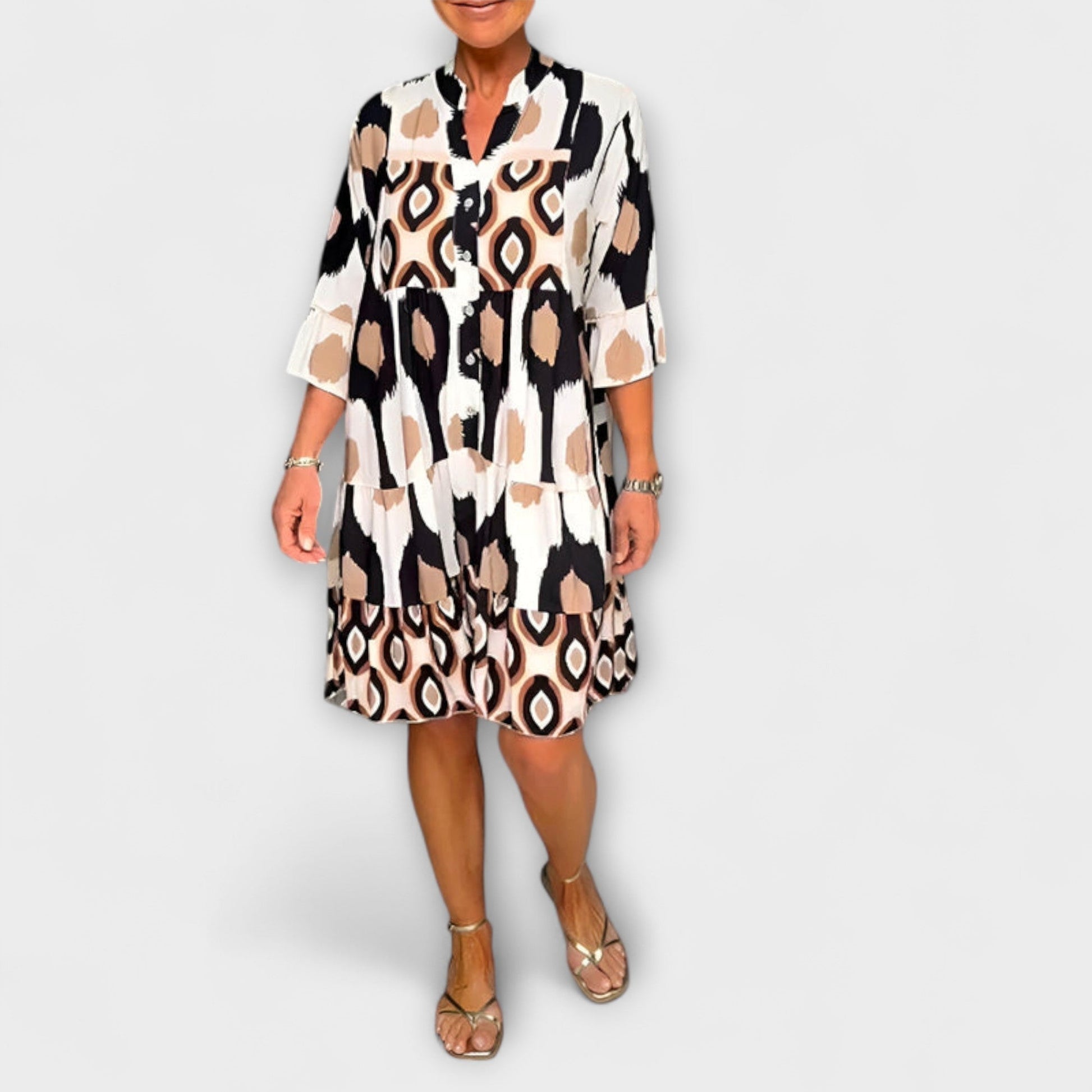 Lehká, prodyšná tkanina a vrstvená sukně poskytují elegantní splývání a svobodu pohybu, zatímco V-výstřih s knoflíkovými akcenty dodává nádech sofistikovanosti.