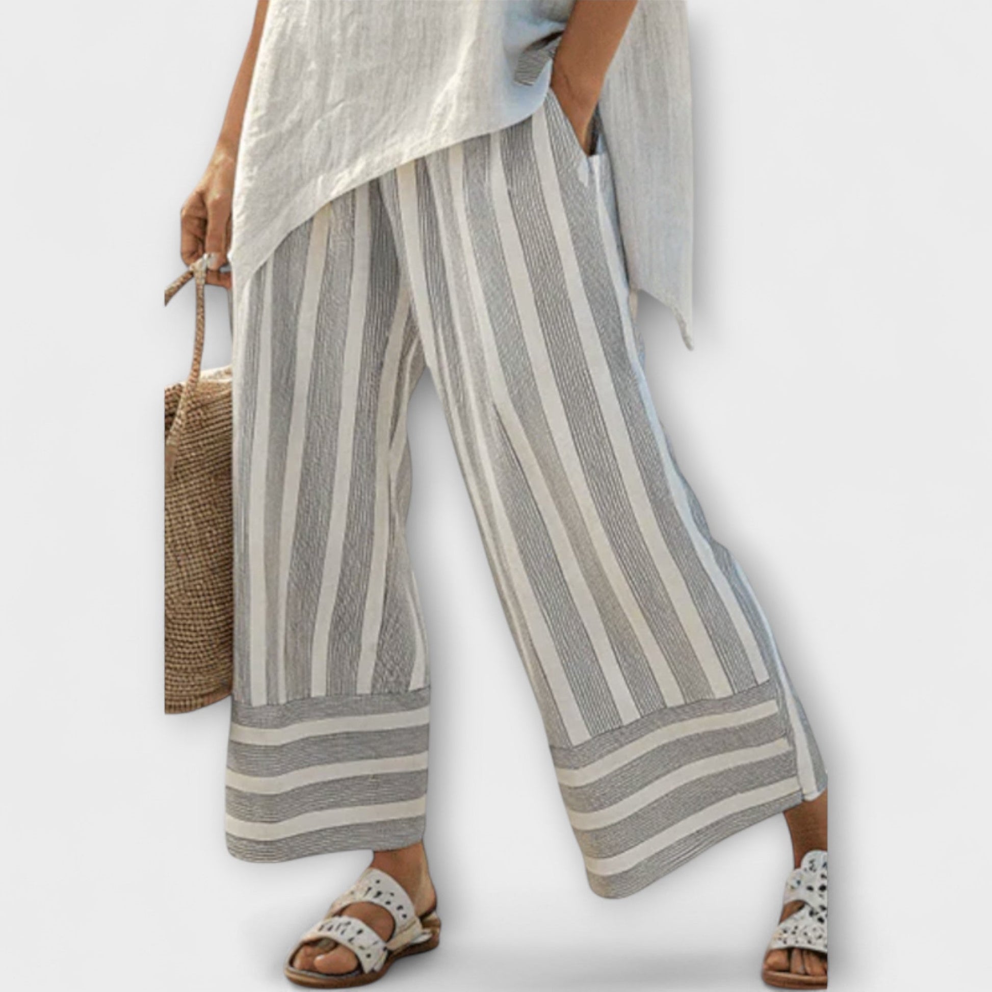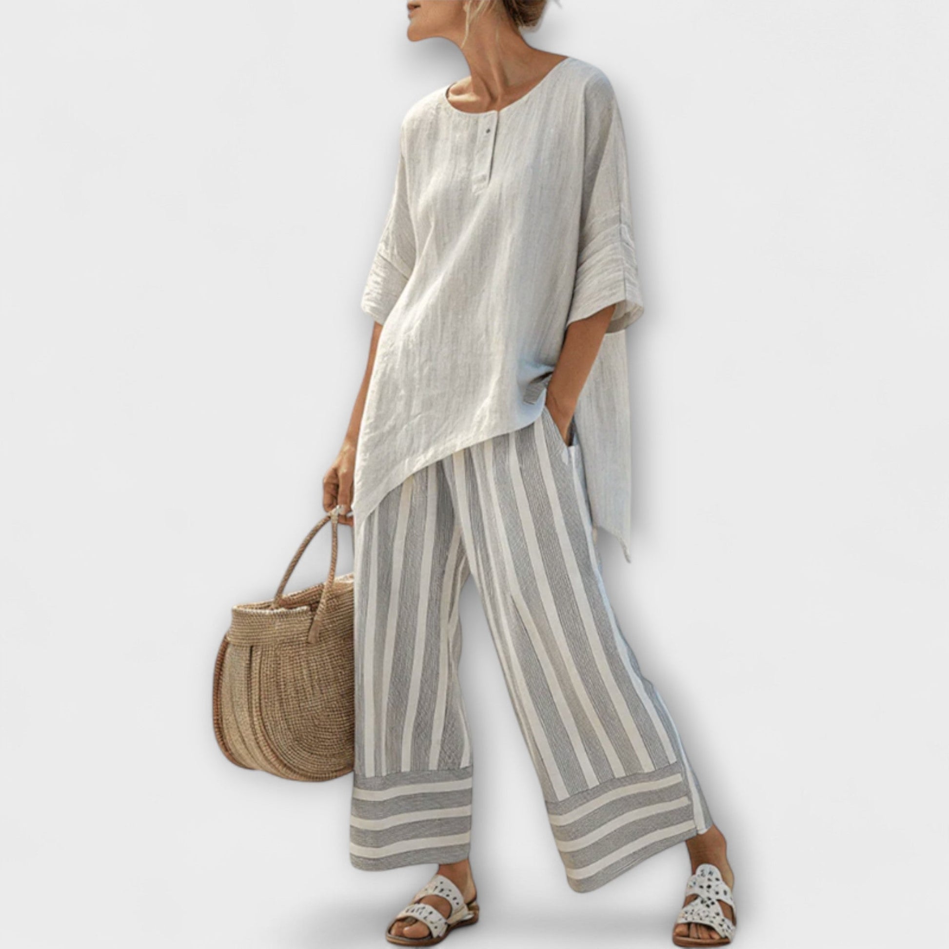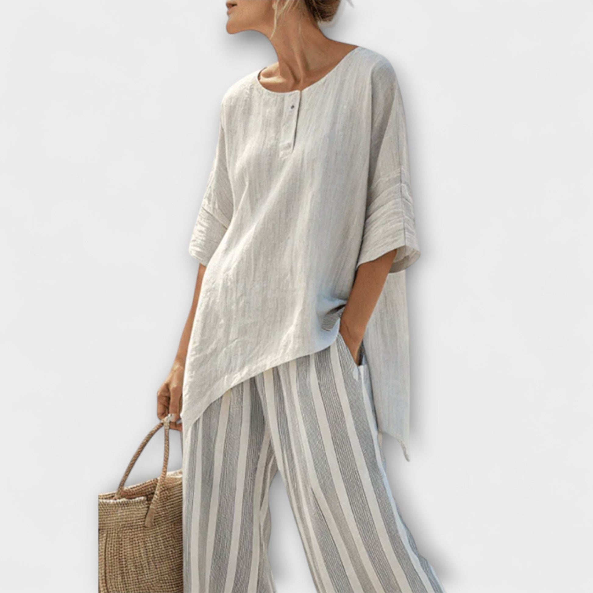 Lucy - Asymetrická Blůza a Kalhoty s Vertikálními Proužky