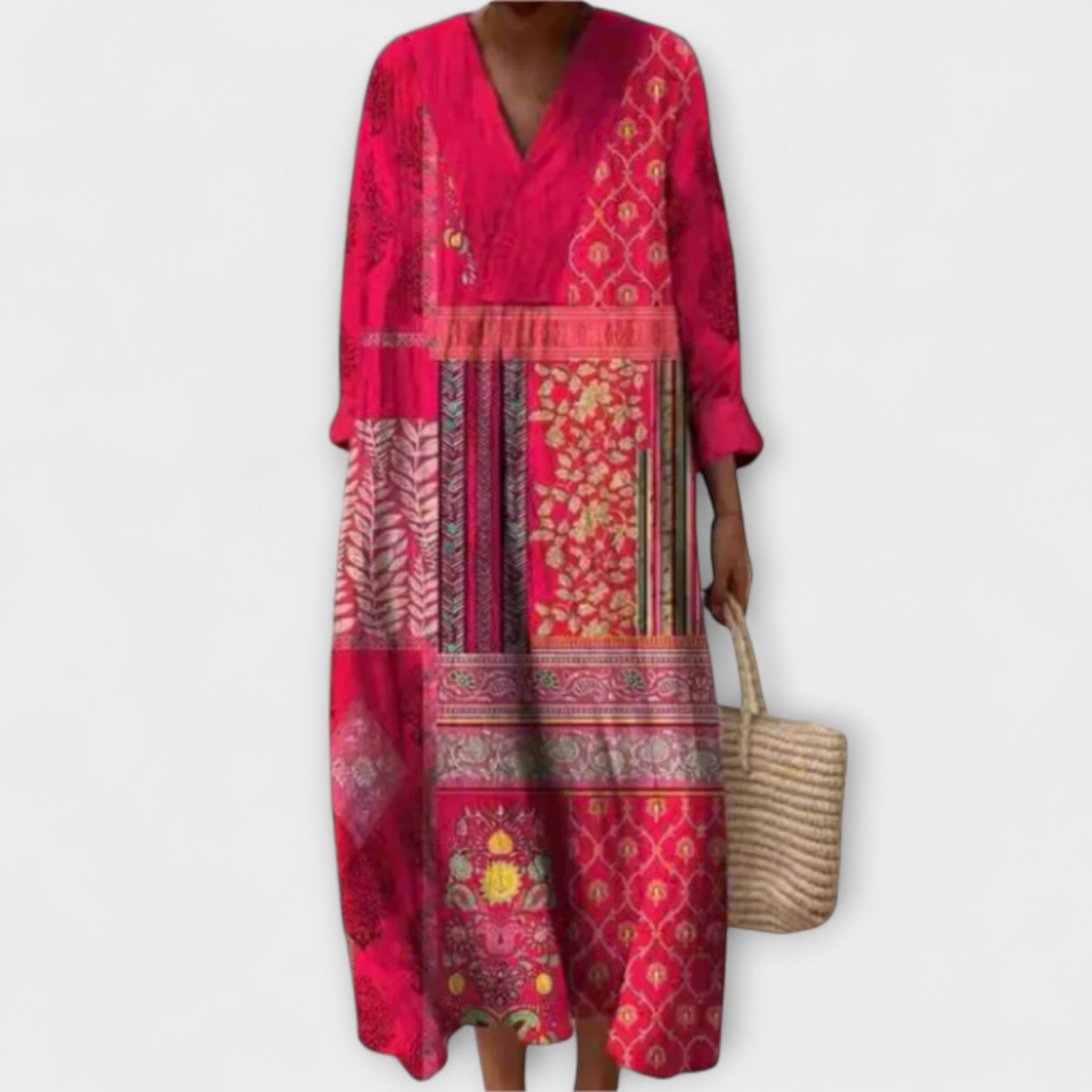 Maisie – bohémské midi šaty s patchworkem a dlouhými rukávy