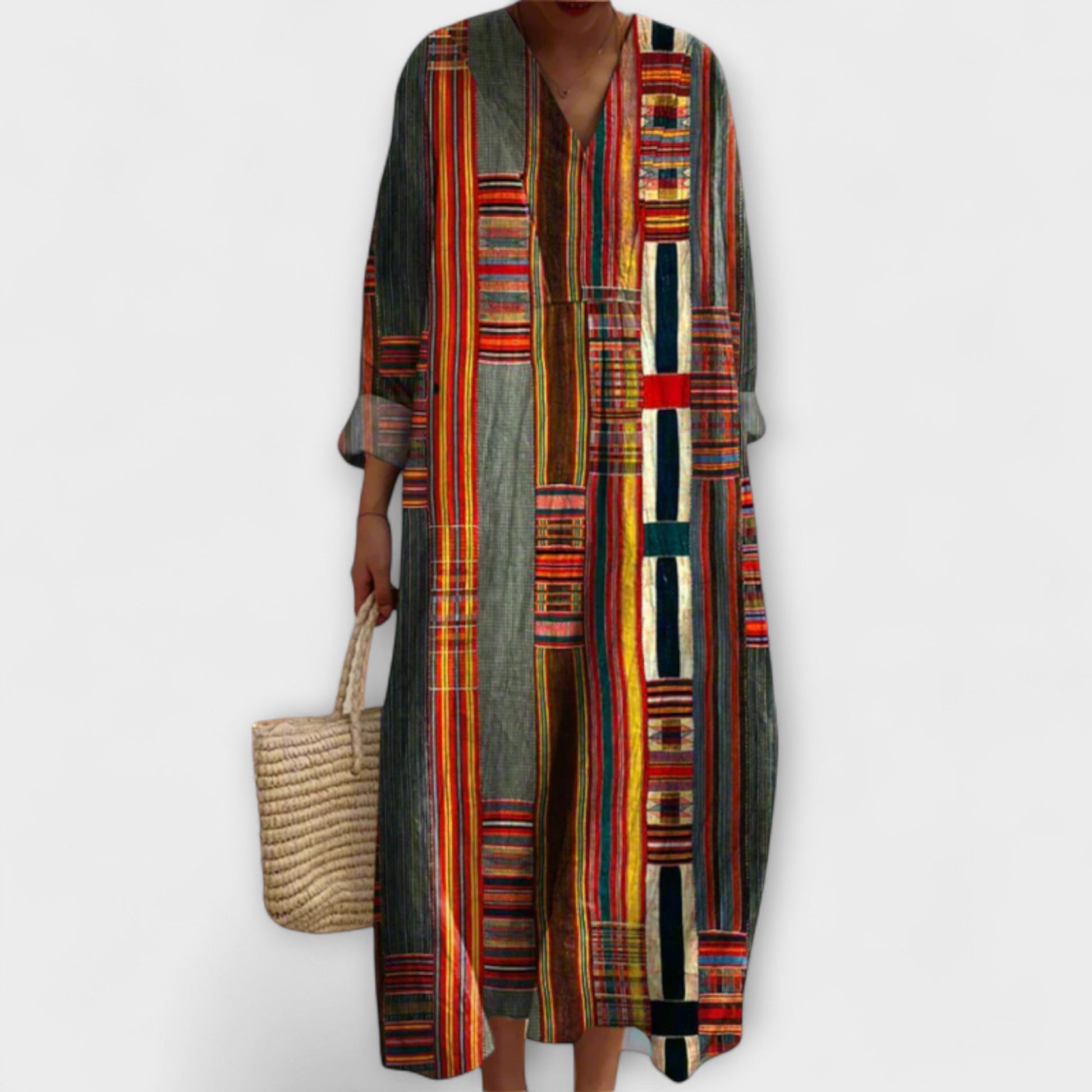 Oslavte dědictví s moderním pohodlím! Propletené patchworkem z tribal-inspirovaných pruhů a živých barev, tyto volné maxi šaty snadno spojují kulturu a sebevědomí. Jejich splývavá silueta lichotí postavě, zatímco vzor energizuje váš vzhled.