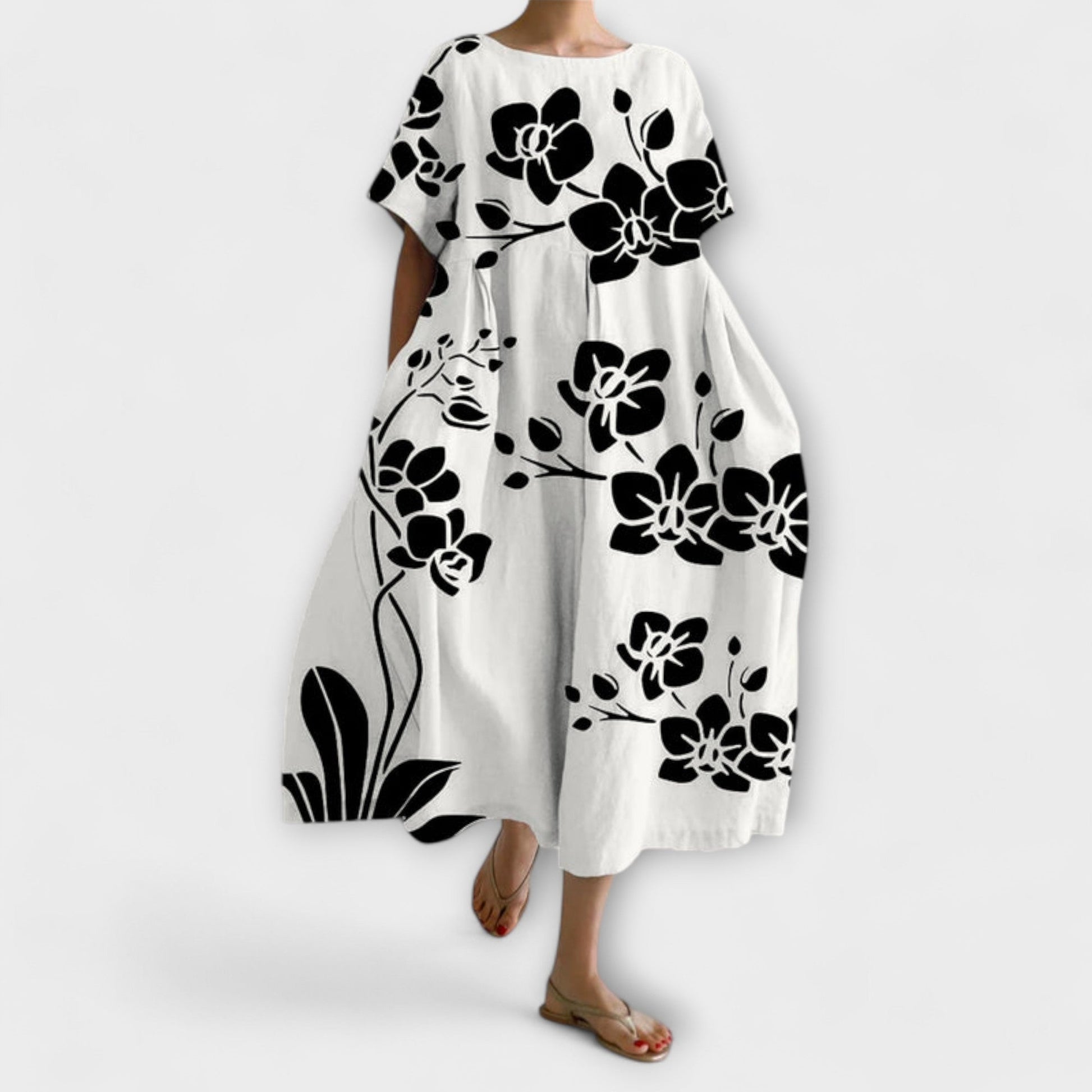 Zažijte bez námahy elegantní styl šatů MARISELLA. Tyto šaty s volnou siluetou a kontrastními černými květinami vás nechají cítit se svobodně a sebevědomě, ideální pro jakoukoli příležitost - od městských procházek po letní večeře.