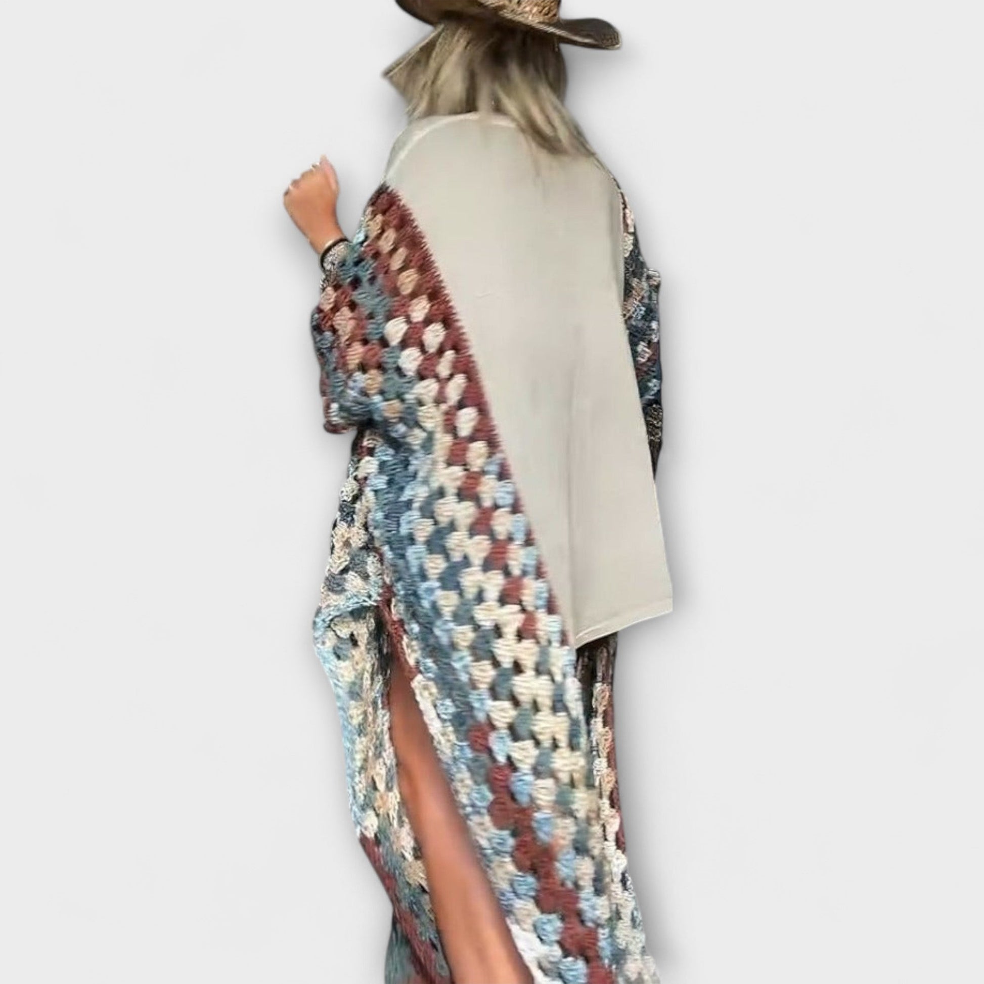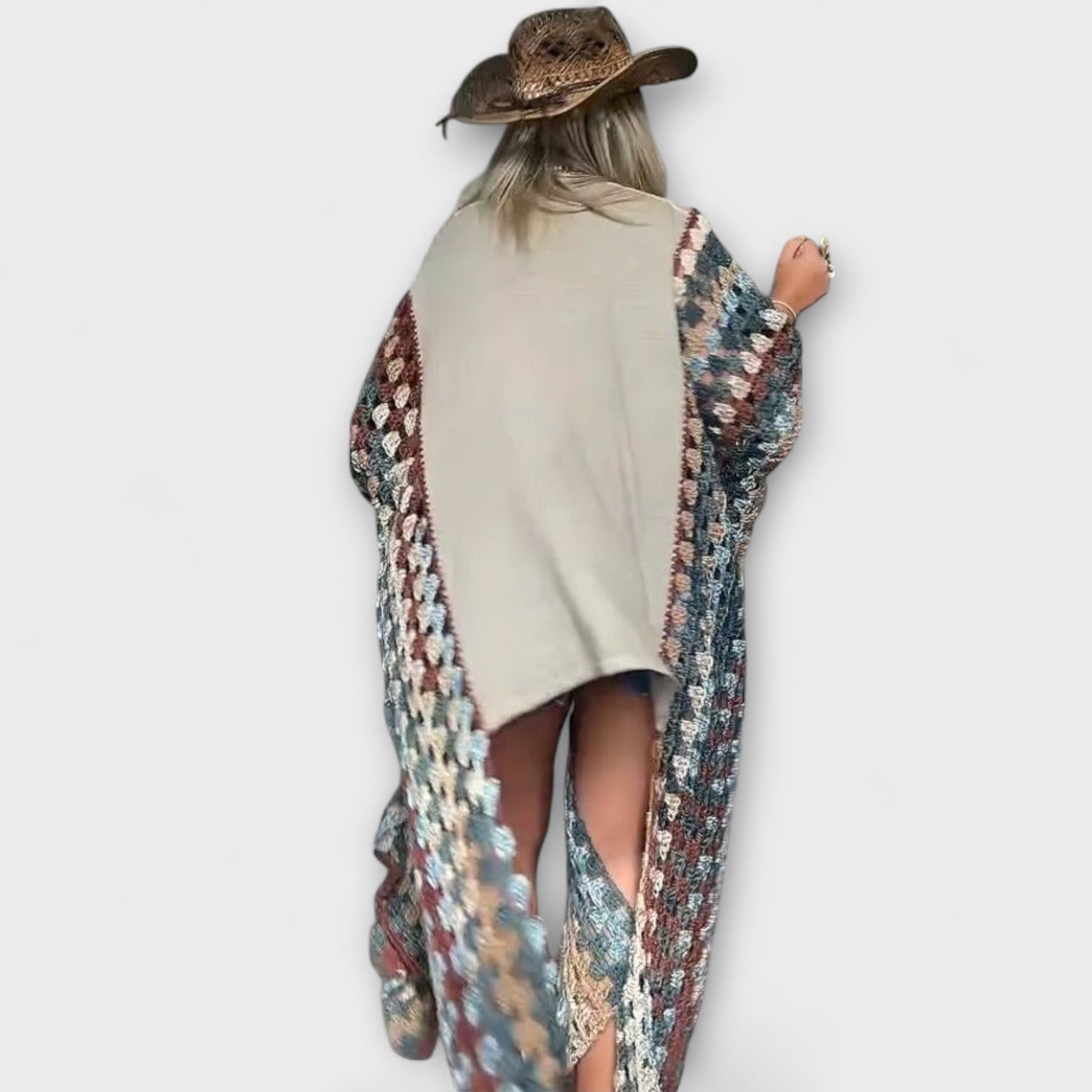 - Kreativní design rukávů: Dlouhé vnitřní háčkované rukávy dodávají neočekávaný objem a pohyb.
