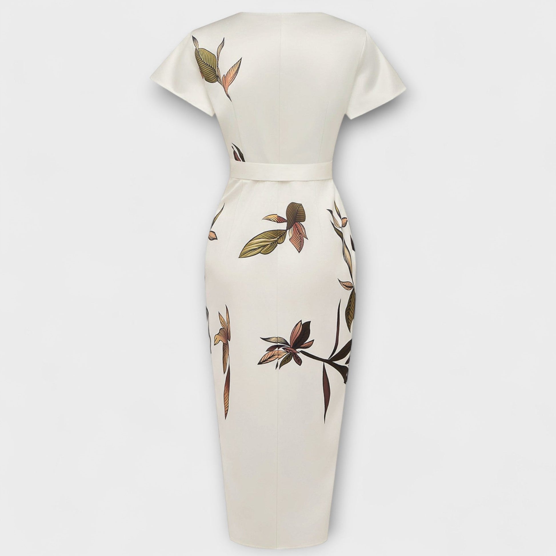 Okouzlující midi šaty se zavinovacím stylem a živým listovým potiskem, které lichotí postavě díky V-výstřihu. Ideální pro jakoukoli příležitost, od brunchů po venkovní akce.