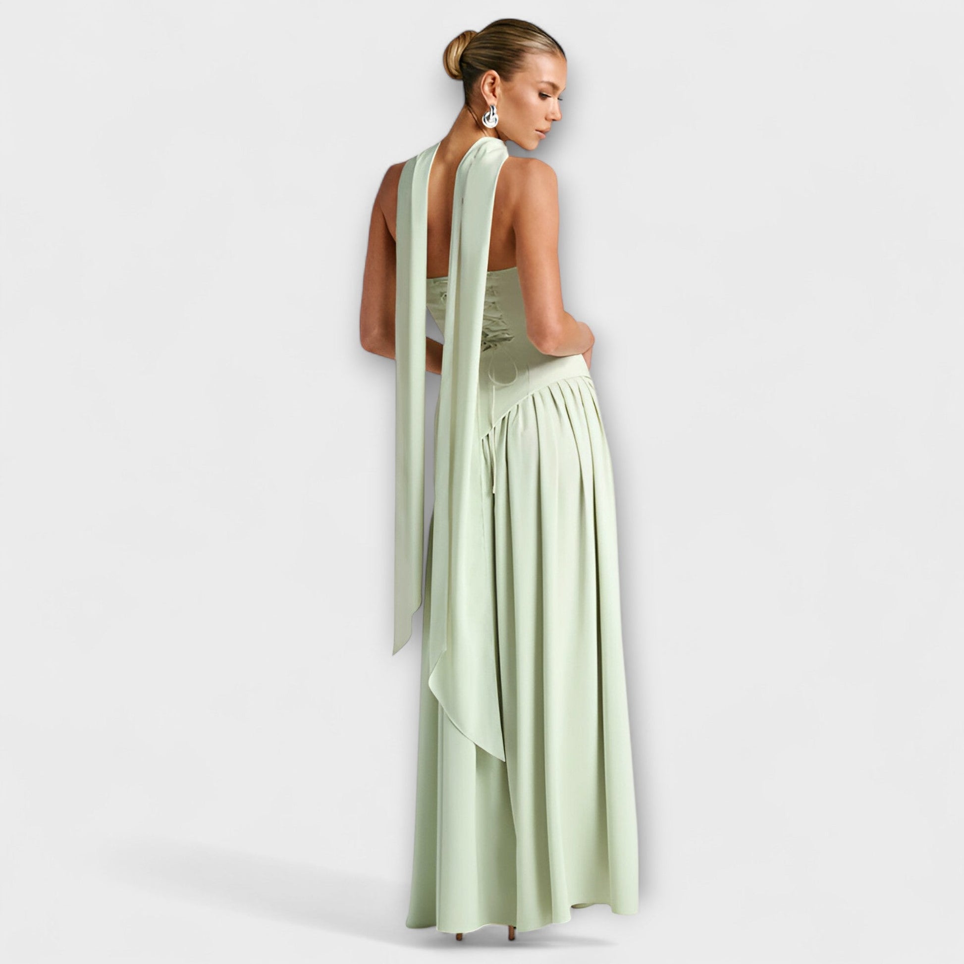 - Detaily: Asymetrický pas, vysoký rozparek, připevněný choker