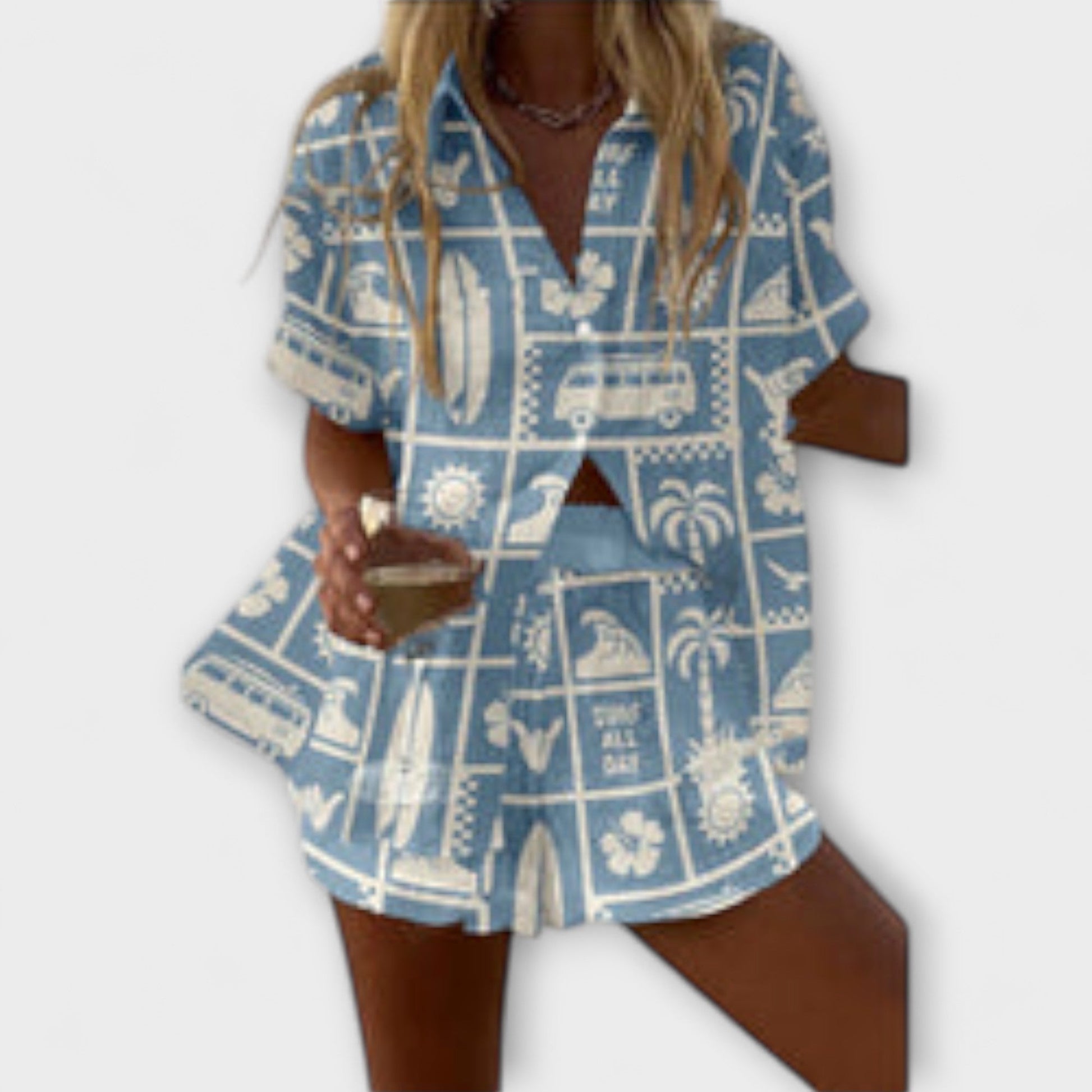 Přijměte svého dobrodružného ducha s Trenara Outfit, okouzlujícím dvoudílným setem s veselým potiskem karavanu. Ideální na cestování, procházky městem nebo relaxační víkendy, tento outfit je navržen tak, aby inspiroval vaši další cestu.