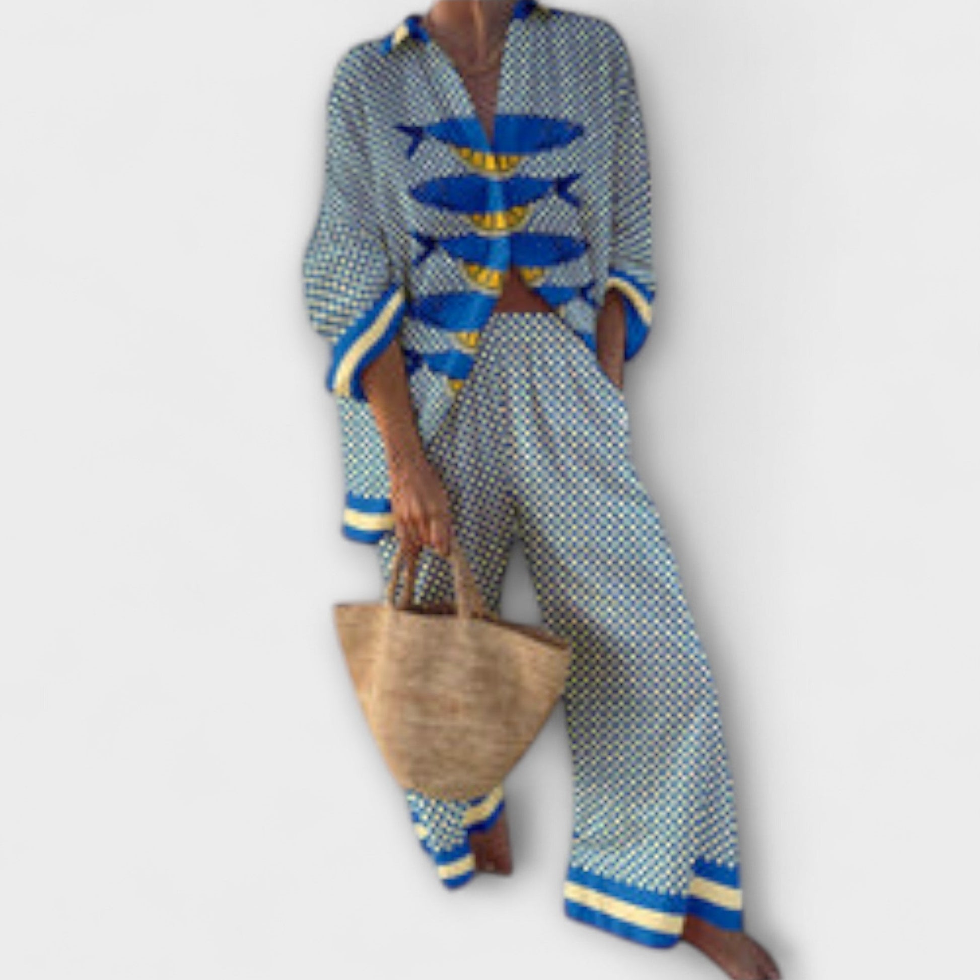 Oživte svůj šatník s Trivela Hravým středomořským kouzlem, které okouzlí potisky sardinek a citronů. Ideální pro slunečné úniky, procházky po pláži nebo neformální brunch, tento outfit skvěle ladí se sandály a slaměnou taškou pro chic pobřežní atmosféru.