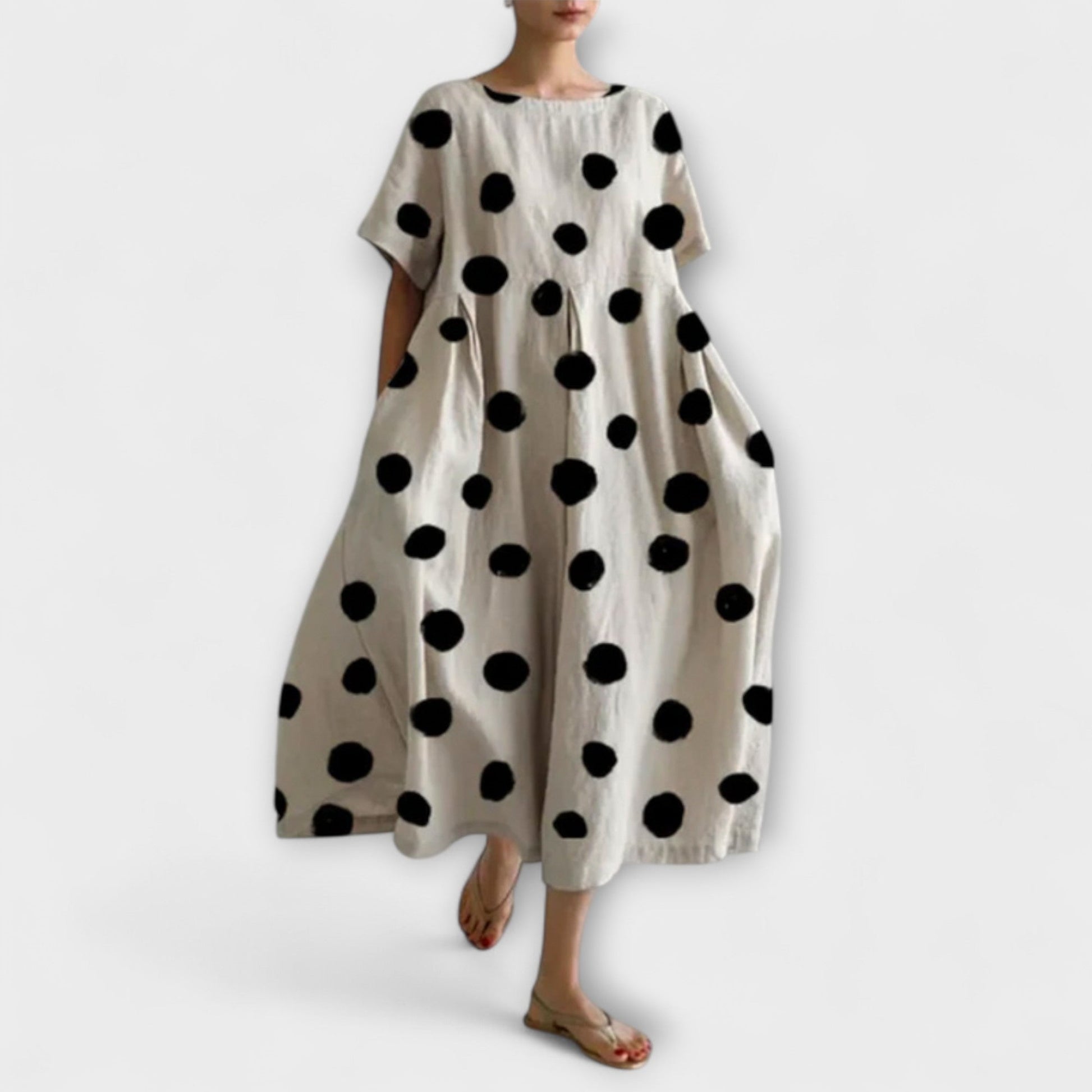 Představujeme šaty VALENTINA: dokonalá kombinace pohodlí a elegance, která promění každý den v okamžik stylu. S ikonickými černými puntíky na neutrálním pozadí tyto šaty vyprávějí příběh nadčasové módy a dodávají vašemu šatníku hravý, ale sofistikovaný nádech.
